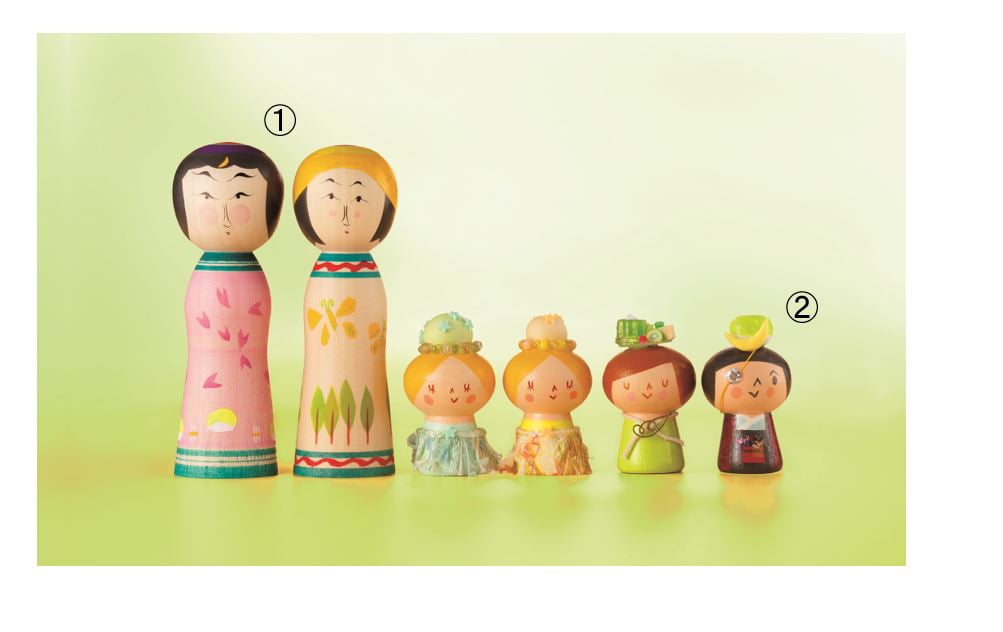 宮城「メリーメリークリスマスランド」の(1)「創作こけし旅こよみ」(ミズキ材、約径4×高さ12cm/各3,200円)、(2)「創作ミニこけし」(天然木、約径3×高さ5.5cm/各3,300円) -