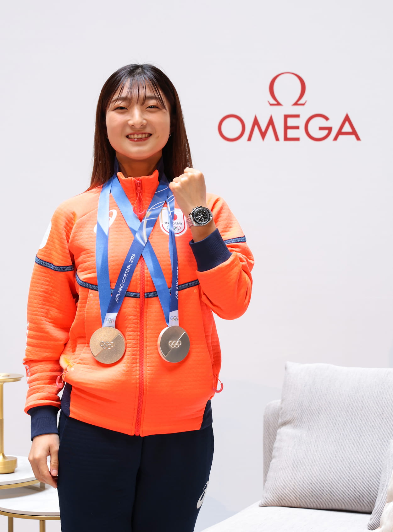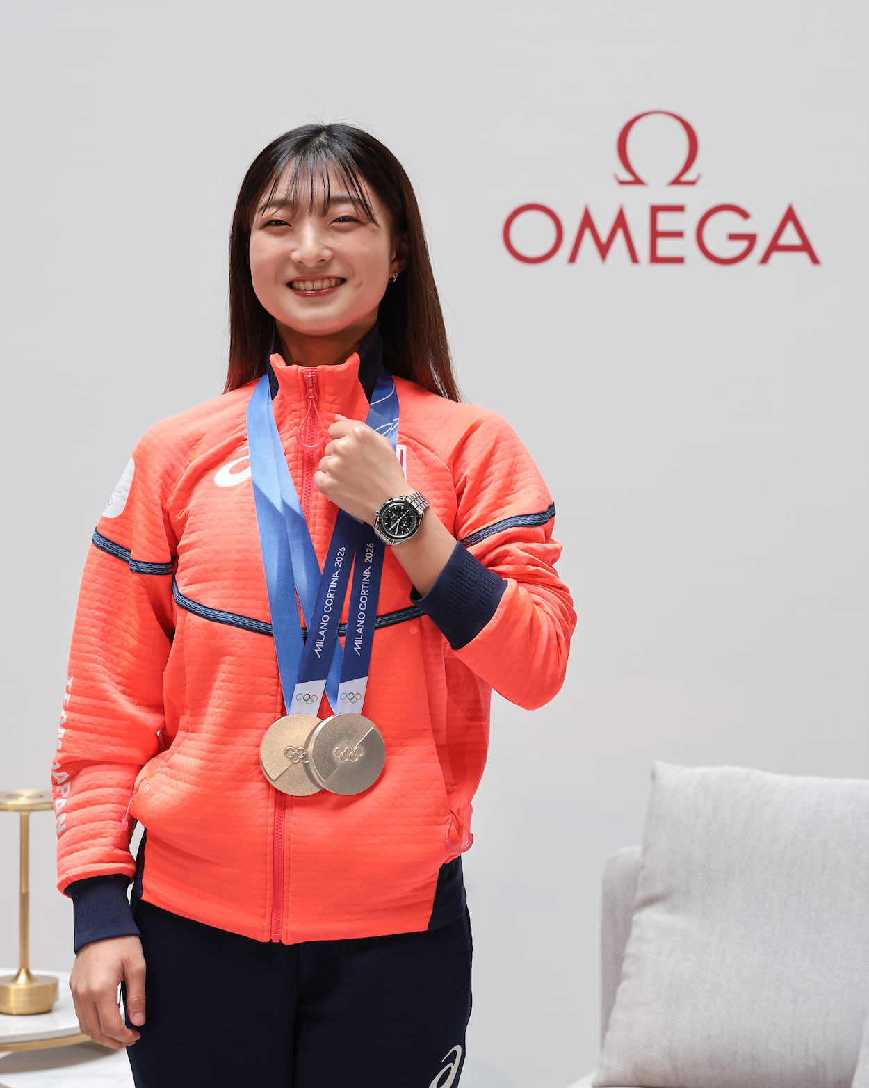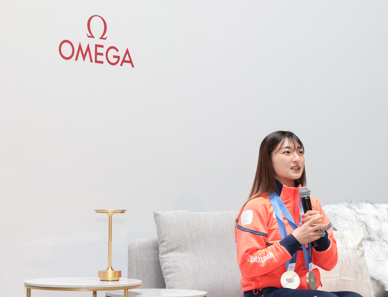首からメダルを下げ、左手にはオメガの「スピードマスター ムーンウォッチ」を身につけた坂本選手。イベントの冒頭では、まずオリンピックを振り返り、感謝の気持ちを伝えました。