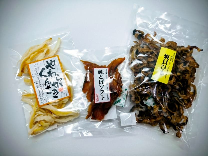 「エビス商会」の「やわらかくんさき(100g)」、「鮭とばソフト(60g)」、「焼貝ひも(120g)」(各1,080円)