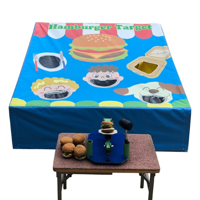 バーガーターゲット/叩き台にハンバーガーをのせて、ハンマーで思いっきり叩きハンバーガーを飛ばします。ハンバーガーを上手く食べさせられたら成功です。 -