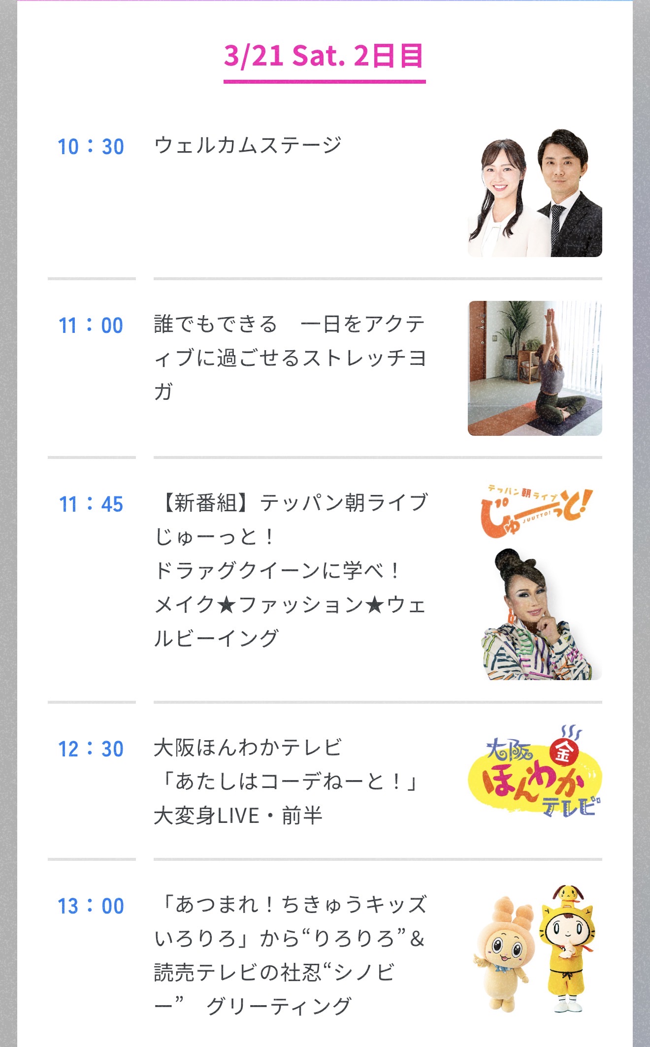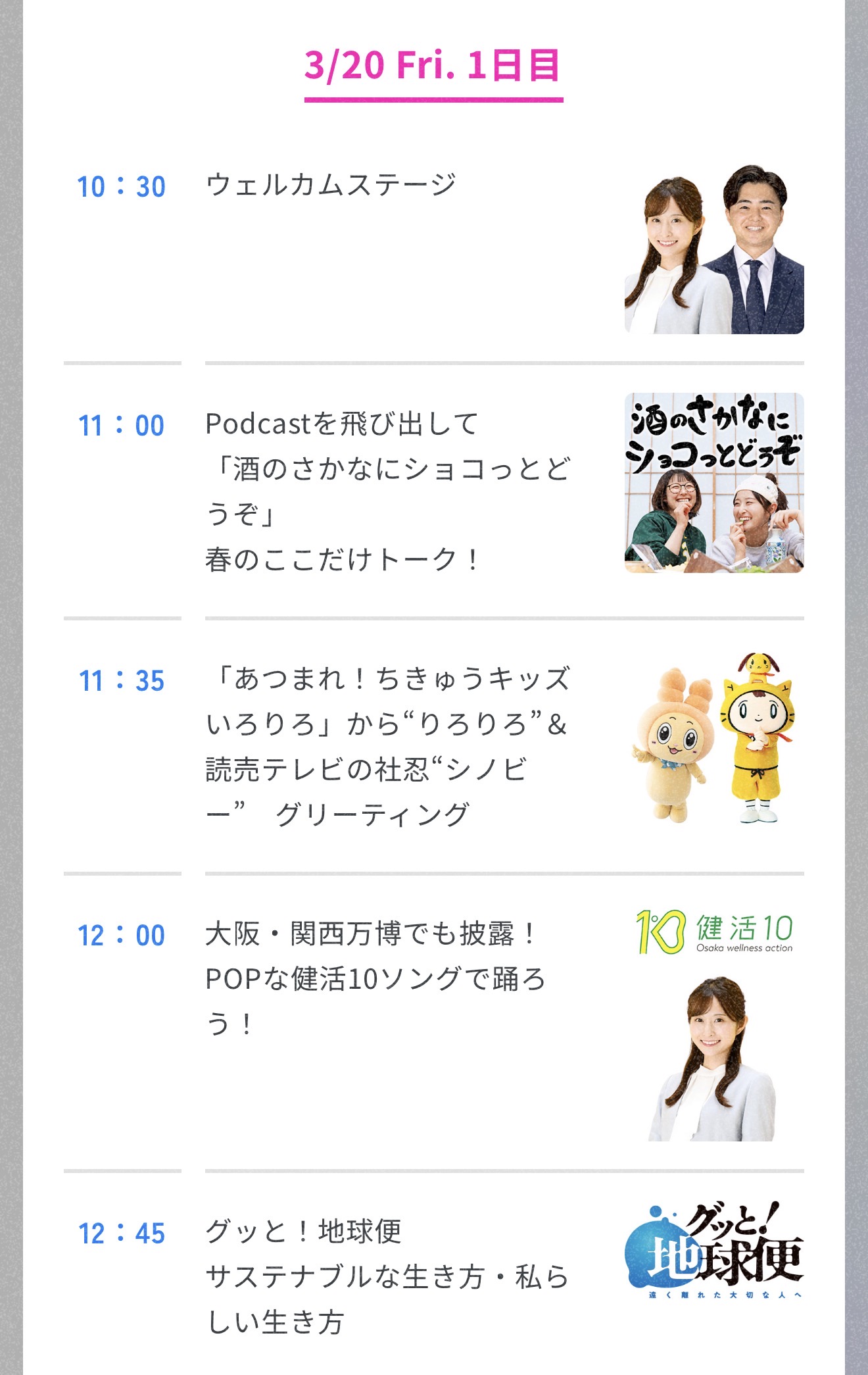 入場は無料、読売テレビ本社1階10plaza・10hallを会場に、3月20日(金・祝)・21日(土)の2日間にわたりステージやブースでさまざまな企画を展開します。