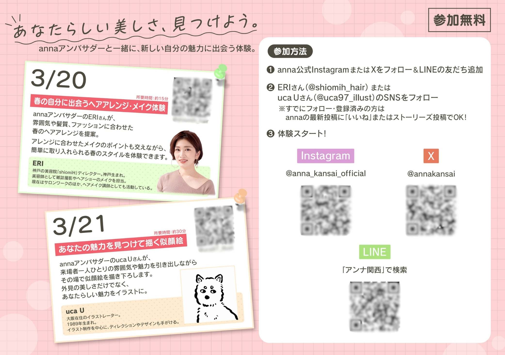 「annaブース」では、annaアンバサダーのERIさんとuca Uさんと一緒に、新しい自分の魅力に出会う無料体験を日替わりで実施します。参加方法は、anna公式InstagramまたはXをフォロー&LINEの友だち追加から。ERIさんまたはuca UさんのSNSをフォローすると、それぞれの体験に参加できます。