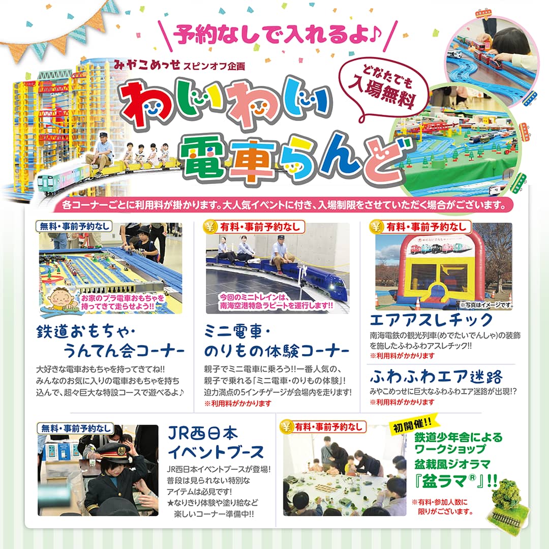 ミニ電車・のりもの体験コーナー、鉄道おもちゃ・うんてん会コーナー、鉄道関連ブース、ふわふわ遊具、ワークショップなどが登場予定。未就学児から小学校低学年くらいまでのお子さんが楽しめます。