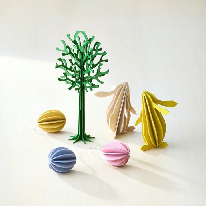 (右)「ロヴィ」の「ラビット」(高さ約9cm/各2,200円)、(左下)「エッグ(3色ミックス)」(約4.5cm/6個入り/3,960円)、(左上)「ツリー(フォレストグリーン)」(高さ約16.5cm/2,640円) -