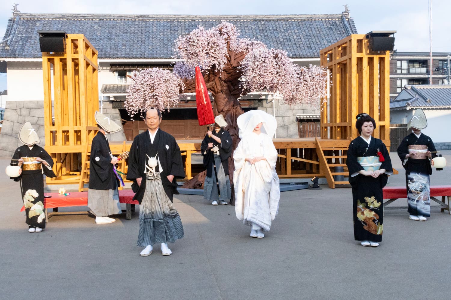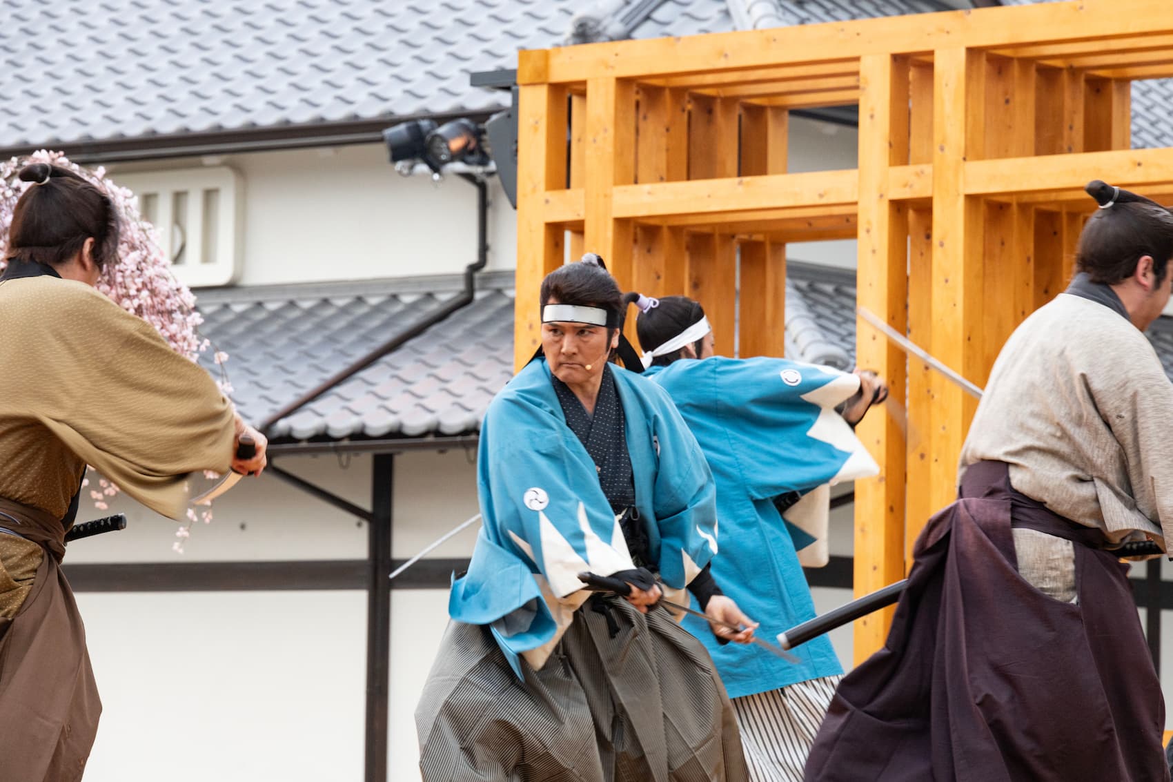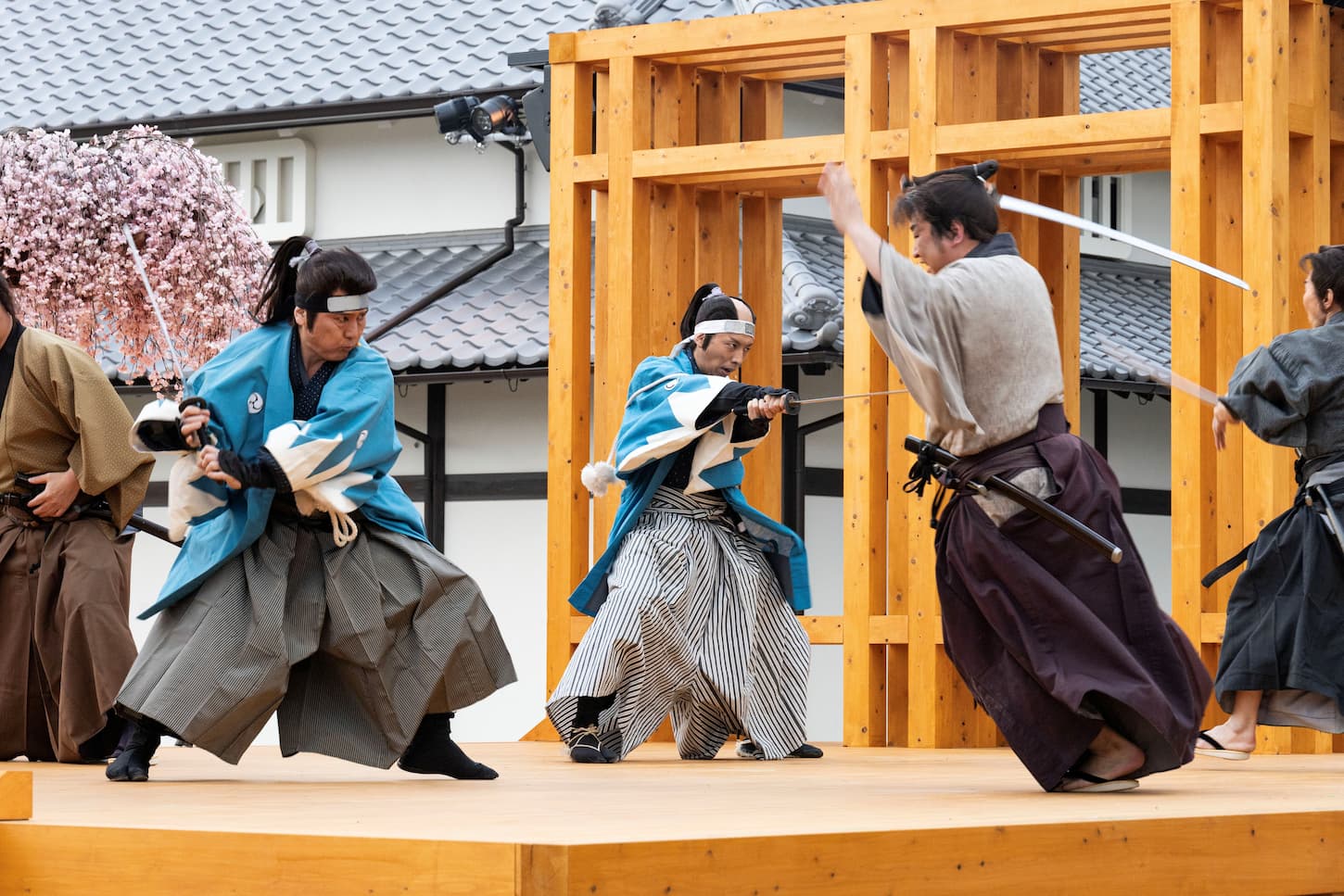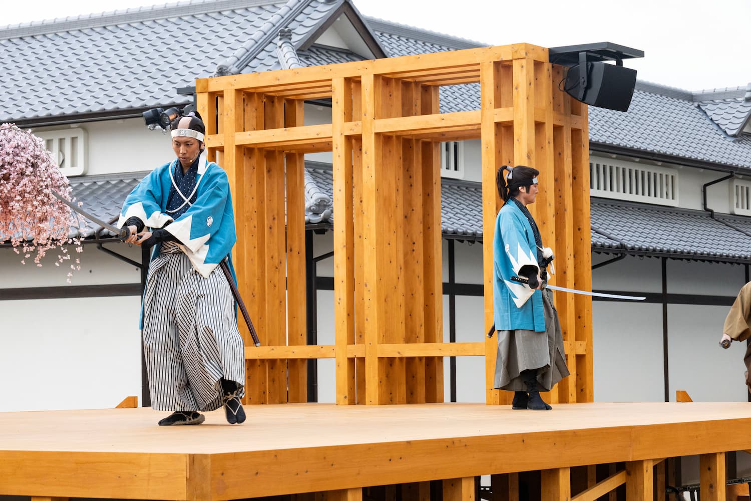 新たな看板ライブショーが「360°リアルタイムドラマ」。村全体を舞台にしてリアルタイムでドラマが進行していきます。この春の演目は『花嫁道中 桜の宴』。ストーリーは、京の街で行われる花嫁道中を、長州の不逞浪士たちが狙うという不穏な噂が……。その真相を知るべく新選組の土方歳三、沖田総司が街を巡り……というストーリー。
