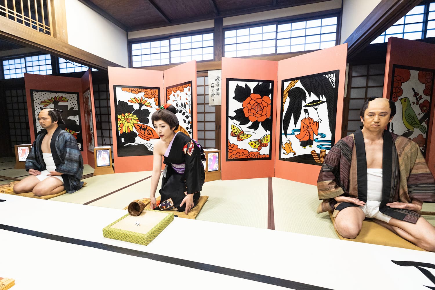 「修練道場」では侍の心得を学びます。入門生になった気分で刀を手にすれば、気分はすっかり江戸の侍!? 所要時間は約15分で、来場者は道場の弟子として刀の振り方や礼の方法などを学べるほか、立ち回りの演舞も間近に見ることができます。