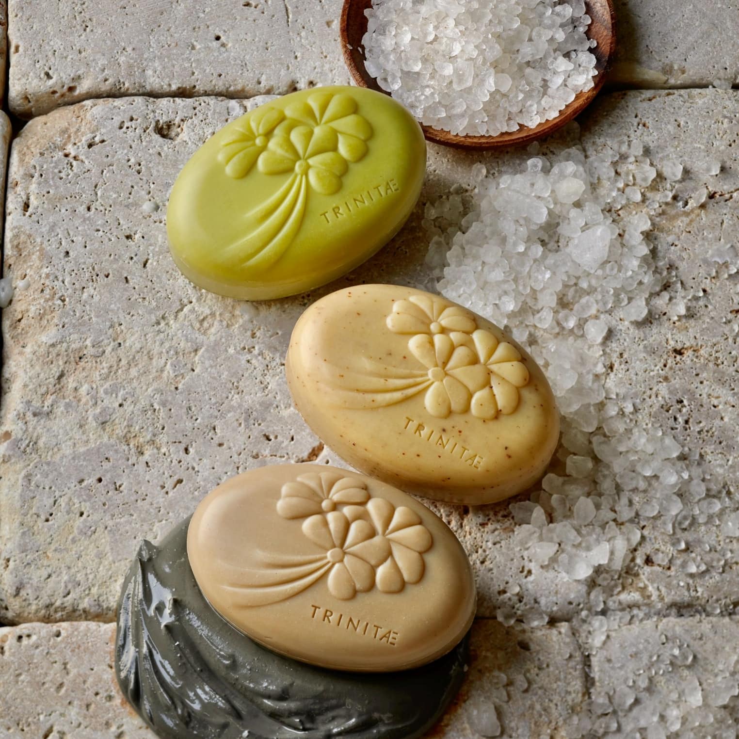 上から、「ソルトソープ バーベナ&シア」、「スクラブソープ ザクロ&ネロリ&アンズ」、「マッドソープ 死海の泥&ホホバ」