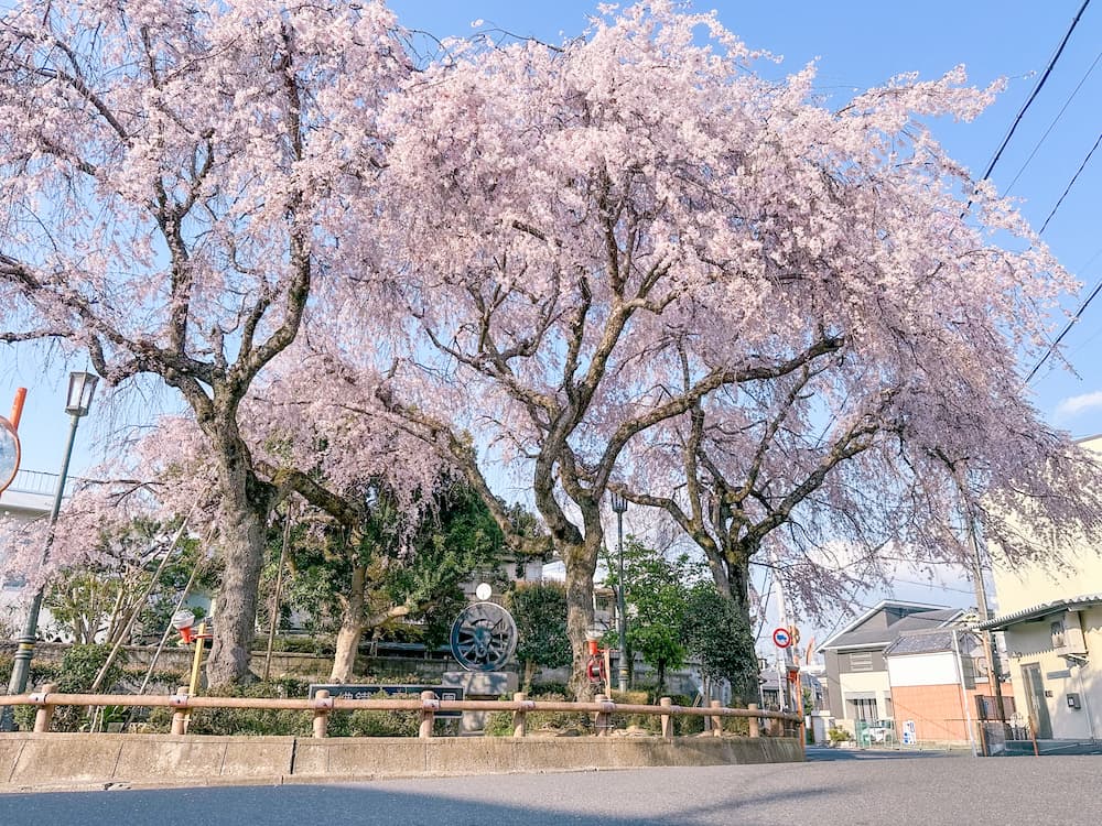 明治時代、加茂駅~大仏駅間の約10kmを運行していた幻の鉄道「大仏鉄道」。現在、大仏駅の跡地は「大仏鉄道記念公園」として整備されており、当時の面影を伝える動輪のモニュメントが置かれています。春になると、濃いピンク色のシダレザクラが青空を背景に咲き誇り、歴史ロマンを感じながらのお花見散策スポットとして、ひそかな人気を集めています。
