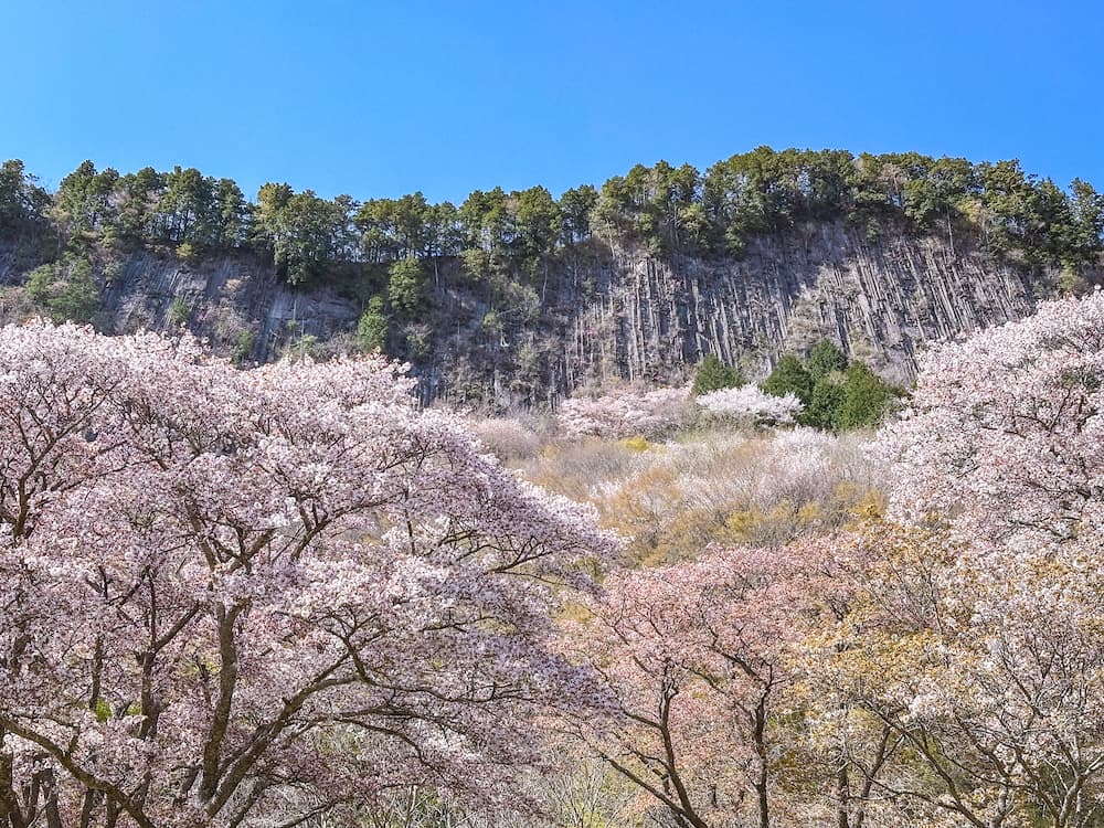 国の天然記念物『屏風岩(びょうぶいわ)』は、その名の通り高さ200mの柱状節理の岩壁が屏風のように屹立する奇峰で、その幅は約2kmにもおよびます。春を迎えると、ノコギリの歯のような荒々しい岩肌にミツバツツジなどが彩りを添え、麓の公苑では約300本のヤマザクラが咲き誇ります。大自然の迫力と可憐な桜のコントラストは必見です。