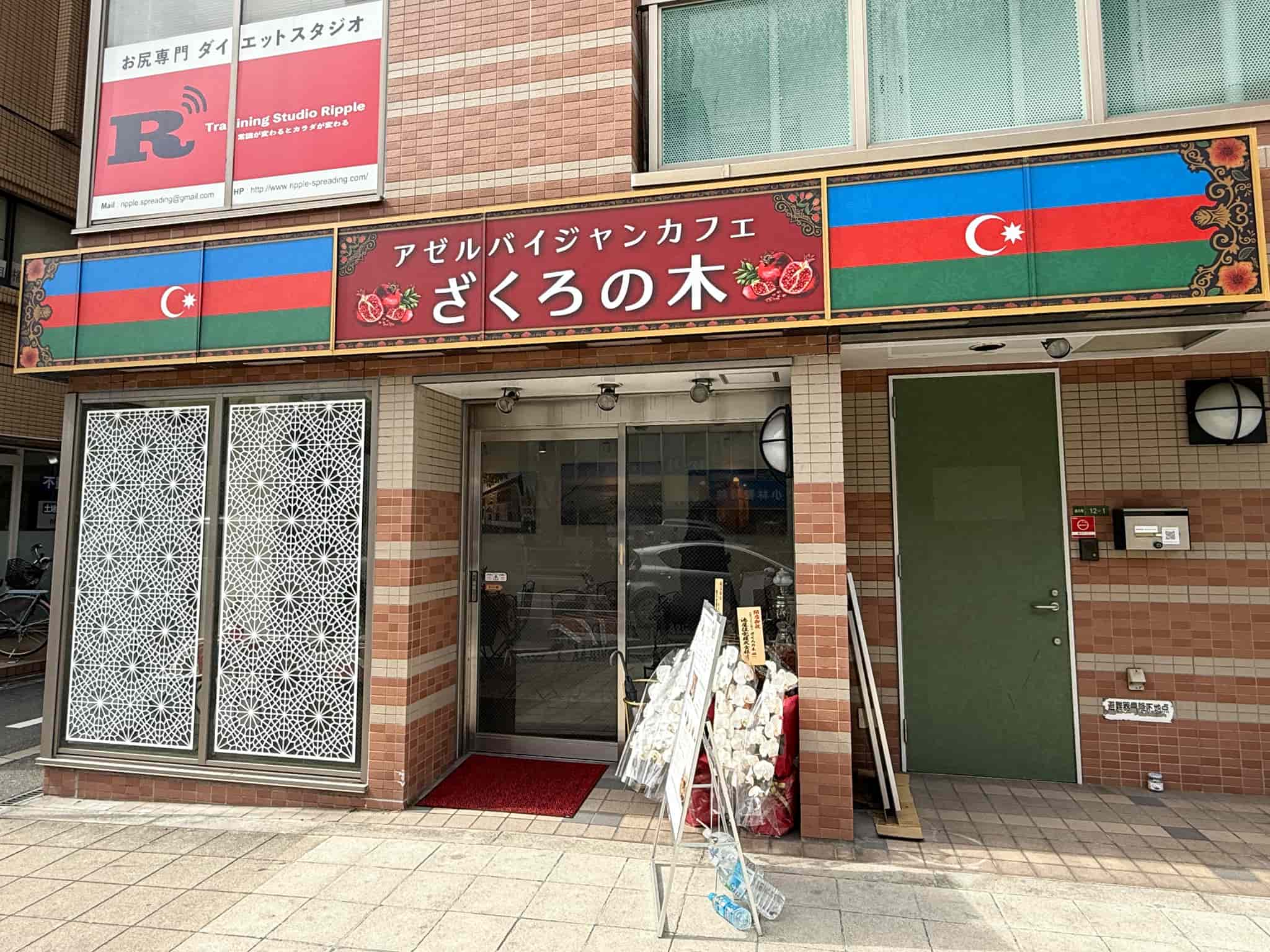 国旗が描かれた鮮やかな看板がひときわ目を引く「アゼルバイジャンカフェ ざくろの木」があるのは、大阪メトロ「天神橋筋六丁目駅」13番出口を出てすぐ。