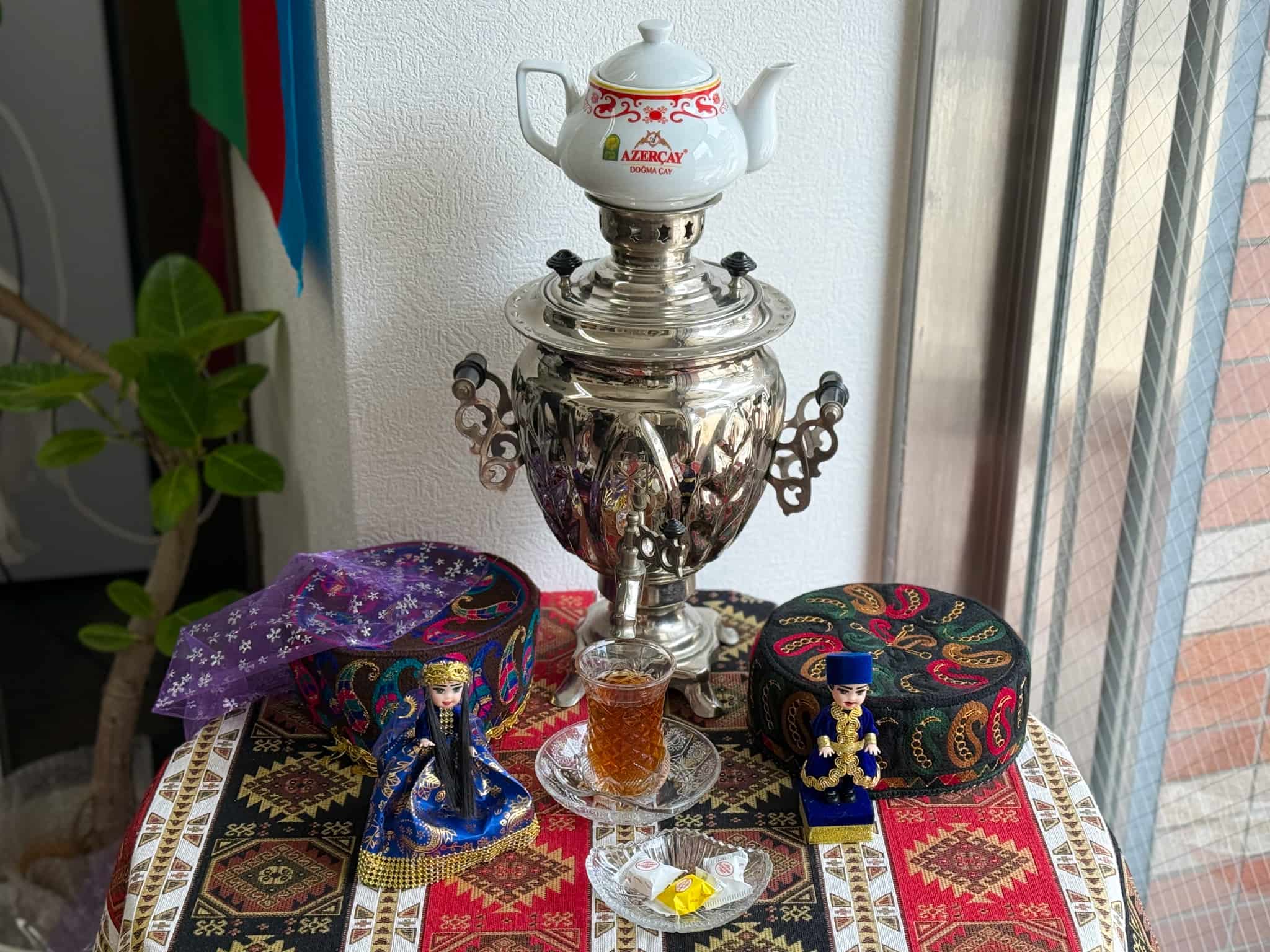 こぢんまりとした店内に一歩入ると、そこはまるで異国。伝統的な幾何学模様の色鮮やかなテーブルクロスや、アゼルバイジャンのティー文化に欠かせない銀色の湯沸かし器「サモワール」などが飾られ、気分が高まります。