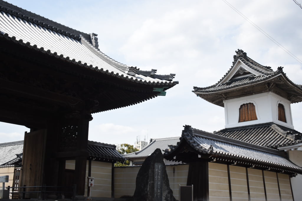 豪華な彫刻が施された表門や、シンボリックな太鼓楼、重厚な五筋の横線が入った築地塀は、大和高田市の有形文化財にも指定される立派な造り。この寺内町を中心に綿業などの商業が発展し、商都・大和高田の礎が築かれました。周辺では、現在も江戸から昭和にかけての風情ある町並みを見ることができます。