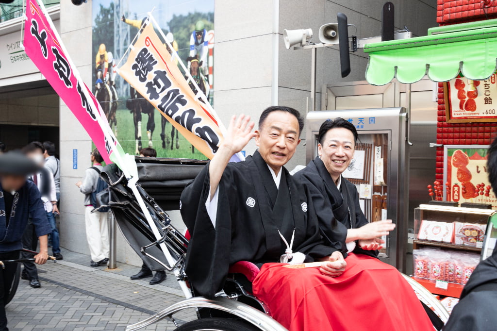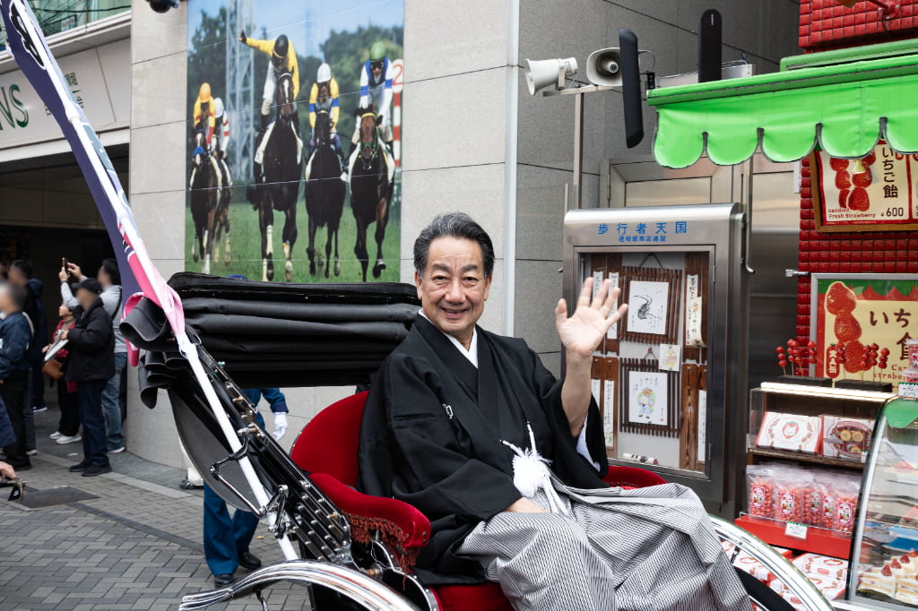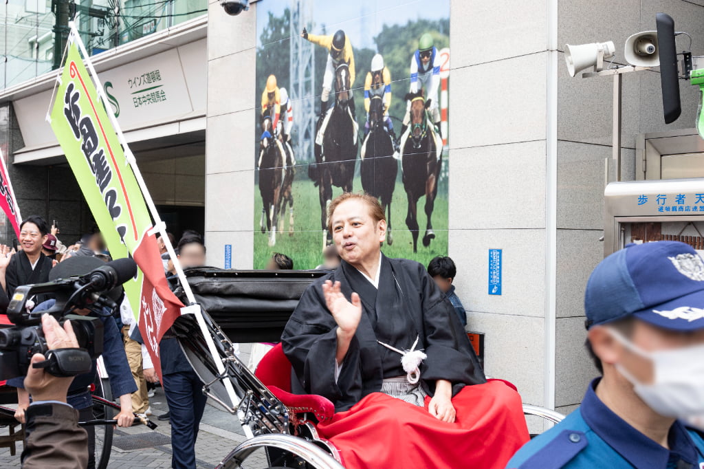 最初に中村鴈治郎がマイク前に立つと、観客からはすかさず「成駒屋!」の声が飛びます。鴈治郎は「最初の挨拶は緊張する」と笑わせると、道頓堀で人力車のお練りは初めてと明かし、「皆様の熱い思いを感じた、道頓堀にこれだけ歌舞伎好きが集まれる、大阪捨てたもんじゃない」と話すと、観衆からは声援が上がります。そして、4月と5月の公演は、大阪松竹座を目に留めてもらうためのものと強調し「松竹座を忘れないでいただきたい」と訴えました。そこからも順に役者たちが挨拶に立つと、詰めかけた観客からは、大向うの声が上がります。
