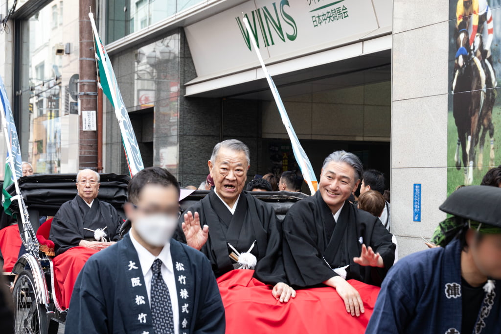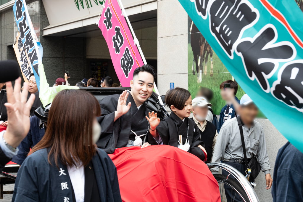 2026年4月3日(金)から大阪松竹座さよなら公演「御名残四月大歌舞伎」を上演する大阪松竹座。その公演前となる3月29日(日)に「大阪松竹座 御名残道頓堀お練り」を実施。東西の豪華出演者たちが、道頓堀を人力車でお練りしたあと、劇場前で挨拶を行いました。