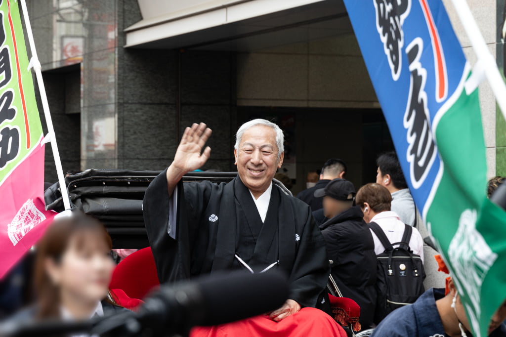 松竹株式会社 代表取締役会長 迫本淳一氏は詰めかけた人たちに御礼を伝えると、大阪松竹座の歴史について振り返り、改めて感謝を伝えます。この5月に一旦大阪松竹座が閉館になることを話し、最後の公演は豪華な顔ぶれであること、そしてこれまでの思い出を心に観劇を楽しんでいただければとアピール。そして、お練りでお客さまからのご声援を肌で感じられたと強調すると、それが心の支え、いい演劇を続けるための心の源泉となると力を込めました。