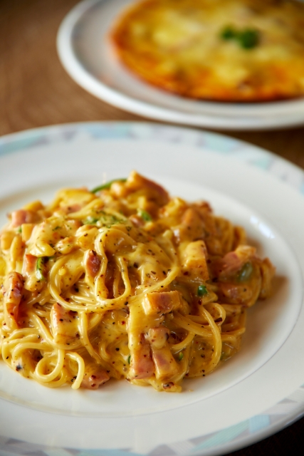 店主の片手一杯分のチーズを使ったぜいたくなカルボナーラは、濃厚な味わいながらヘビーすぎず、軽やかに食べ進められます。ベーコンの塩味と玉ねぎの甘みが絶妙に重なり、数種類のペッパーがアクセントに。