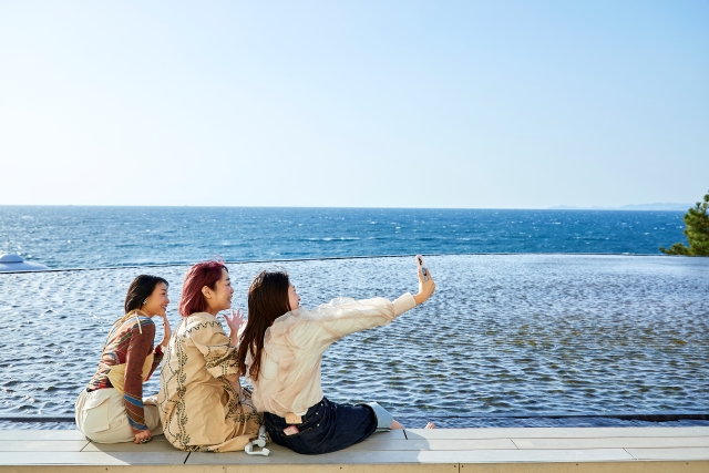 「HOTEL SEAMORE」の本館1階のテラスには、太平洋を一望しながらのんびり過ごせる「インフィニティ足湯」を設置。潮風を浴びながら大海原を眺めていると、なんだか晴れやかな気分になれました。