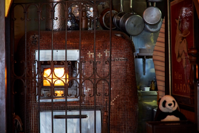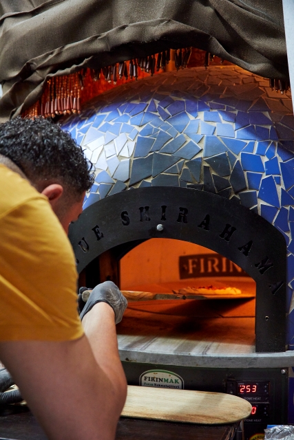 厨房には、トルコからわざわざ送ってもらったという回転式の大きな石窯がスタンバイ。店名にちなんでブルーのタイルが敷き詰められています。こちらの石窯を使って焼き上げる、トルコの伝統的なピザが看板メニューです。