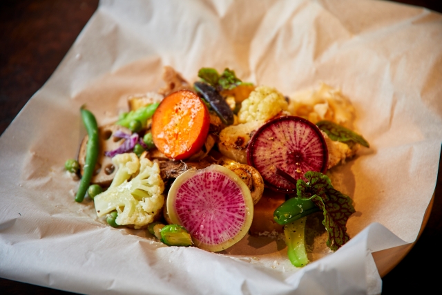 15〜25種類もの地元野菜を使ったホットサラダは、「九十九」といえばの定番メニュー。味付けは、ミカンの皮などをブレンドしたオリジナルの塩とパルミジャーノチーズのみ。薪火でグリルすることで水分を閉じ込め、素材本来の甘みとジューシーな食感を引き立てています。