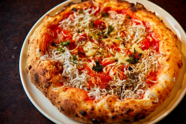 国産小麦を使ったピザは、豊かな香りともっちりとした食感が魅力。白浜の漁港で水揚げされたしらすの旨みと程よい塩味が、トマトのフレッシュな酸味にマッチしています。