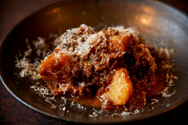 肉質が柔らかくクセの少ないメスのシシ肉を厳選し、玉ねぎやニンジンと共に地元産のクラフトビールでじっくり煮込んだメイン料理。野菜の甘みとビールの苦味が調和し、ほのかに野性味のある肉の旨みが際立ちます。