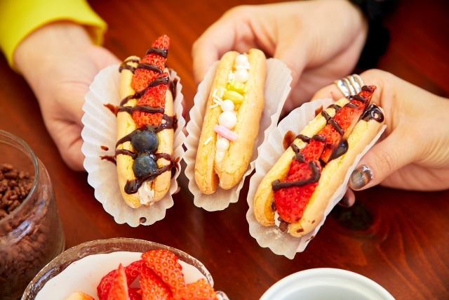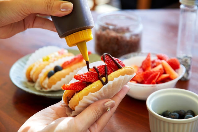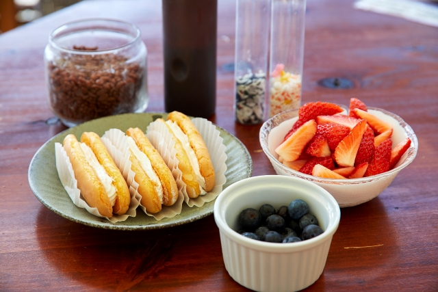 甘さ控えめの生クリームをサンドした生地に、フルーツ、チョコスプレー、ソースなどを自由にトッピング。「かわいくしようね」と意気込みながら、ワイワイ楽しく体験することができました。