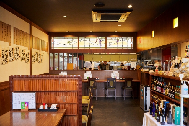 「お造りや焼き物、揚げ物など、地魚を用いた海鮮系の一品メニューがたくさんありました。お酒と料理を楽しんだのち、うどんで〆るのもいいですね。ステンドガラスを取り入れた内装もすてきでした」