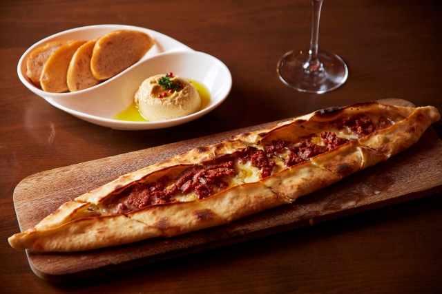 現地では“ピデ”と呼ばれるトルコ風ピザは、細長い船のようなシルエット。外はパリッと、中はもっちりとした食感で、中央にはスパイシーな牛サラミとチーズがたっぷり乗っています。