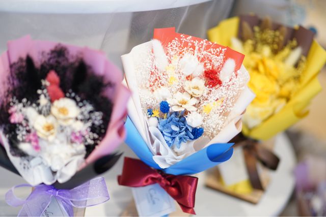 代表商品のドライフラワー・プリザーブドフラワーを使用した花束は、かわいいフォルムと華やかなフレアラッピングが特徴。