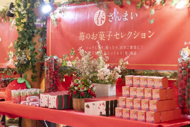 春の訪れとともにスタートした「春ざんまい」では、「道の駅和」と直接契約したいちご農家が、特殊な製法で栽培したいちごを使ったスイーツ約50種のほか、全国から厳選した約50種のいちご商品が集結。