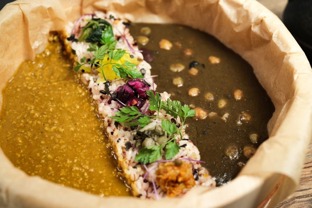 提供されるカレーは、動物性食材を一切使用しないビーガン仕様。植物性の素材のみで旨みやコクを引き出しながら、スパイスの香りと深みを最大限に活かしたひと皿に仕上がっています。