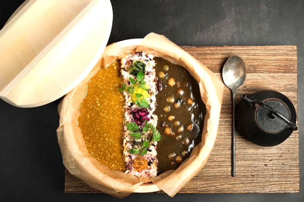 寿司桶の中には、味わいの異なる2種のスパイスカレーと、色鮮やかな雑穀ご飯、さらに季節の野菜を使った5種の漬け物を美しく盛り付け。多彩な味わいと食感を感じながら、少しずつ混ぜ合わせて変化を楽しめる構成になっています。