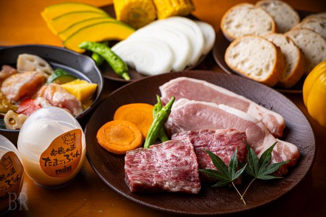 食事は、厳選された国産黒毛和牛や兵庫のブランド牛「姫路和牛」などを堪能できる2種類のBBQコースを用意。さらに、赤穂ならではの新鮮な海鮮オプションもあります。