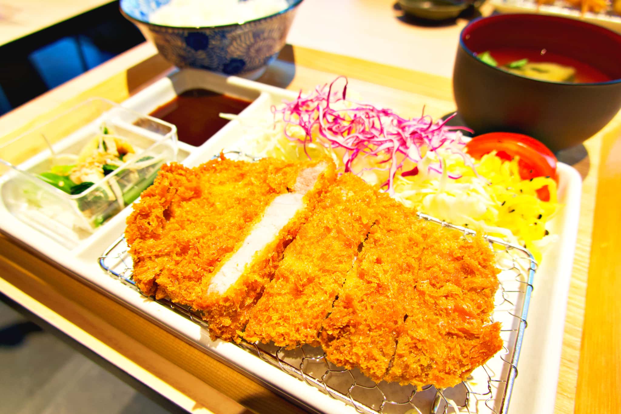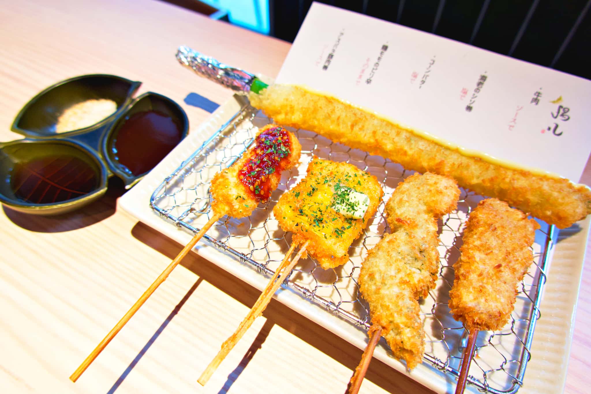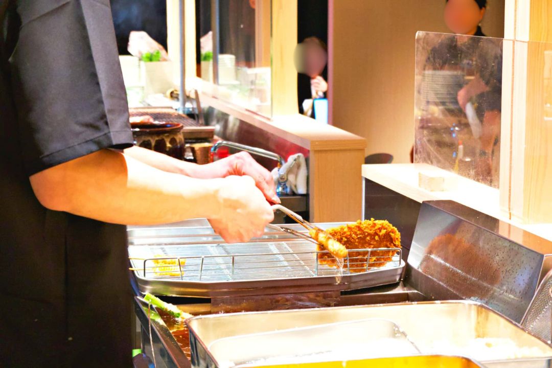 なんばと梅田に3店舗を展開し、淀屋橋初・京阪沿線初出店となる「串カツとワイン 揚八」は、ワインとのペアリングも楽しめる大人の串カツ店。こだわり抜いたブレンド油とオリジナルパン粉を使用し、ふんわりとした軽い食感の揚げ物が自慢です。アスパラ一本や牛肉、鶏モモ、海老などバランスよく楽しめる「串カツ盛り合わせ10本」(2,181円)のほか、月替わりの限定メニューやワインとのペアリングが楽しめます。ランチタイムには、融点が低く口の中で脂が甘く溶ける奈良県産大和ポークを使った「とんかつ定食」(1,299円)も!
