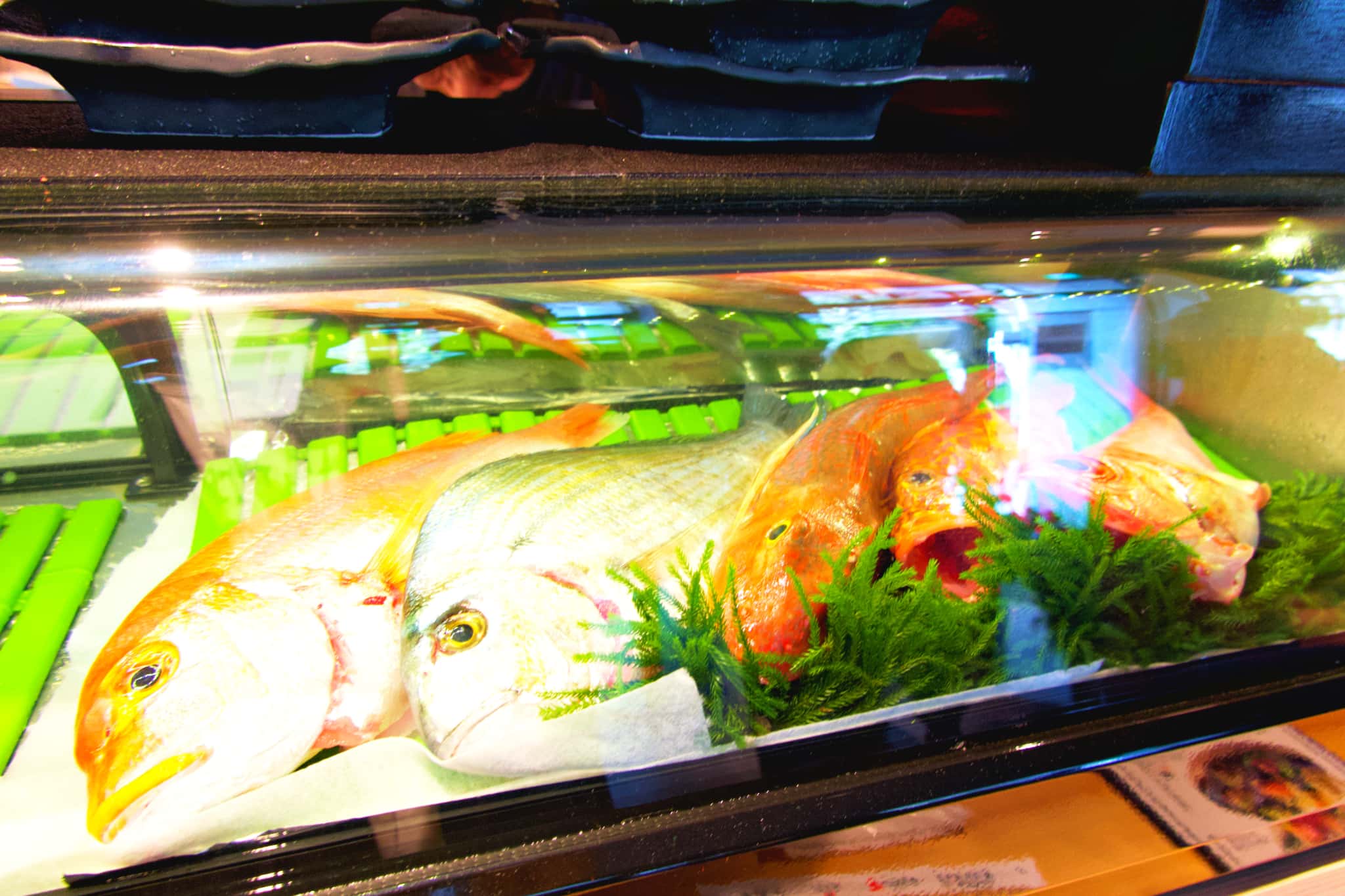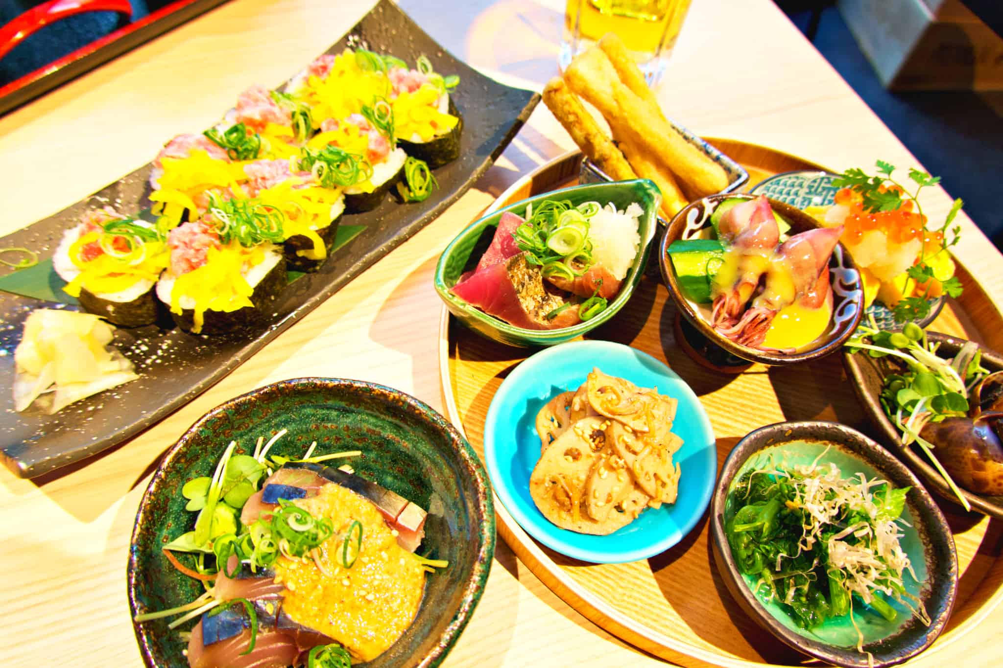 ディナーには刺身や天ぷら、寿司など多種多様な魚料理が並び、こだわりの小皿料理がぎっしり詰まった「豪華おばんざい7種盛り」(1,800円)や、福岡から直送する鮮度抜群の魚介を生かした握り寿司は1貫からオーダーできます。
