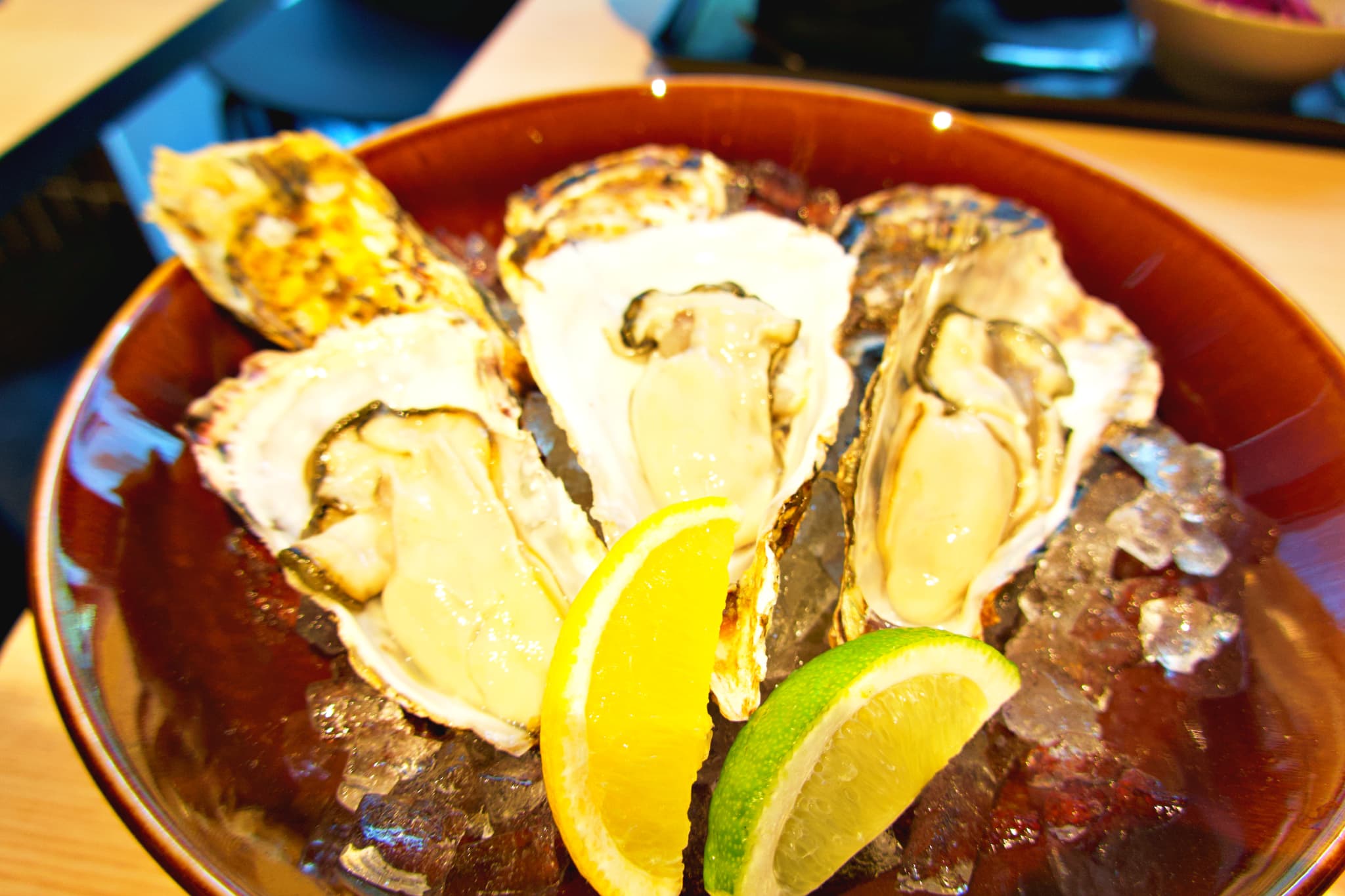 席種も豊富で、中央に配されたオープンキッチンを囲むカウンター席では、串を焼く炎や牡蠣をさばく手元を間近に見ながら食事が楽しめます。また、テーブル席や通りを望むテラス席もあり、一人での昼飲みから、友人や同僚とのディナーまで幅広く利用できますよ。