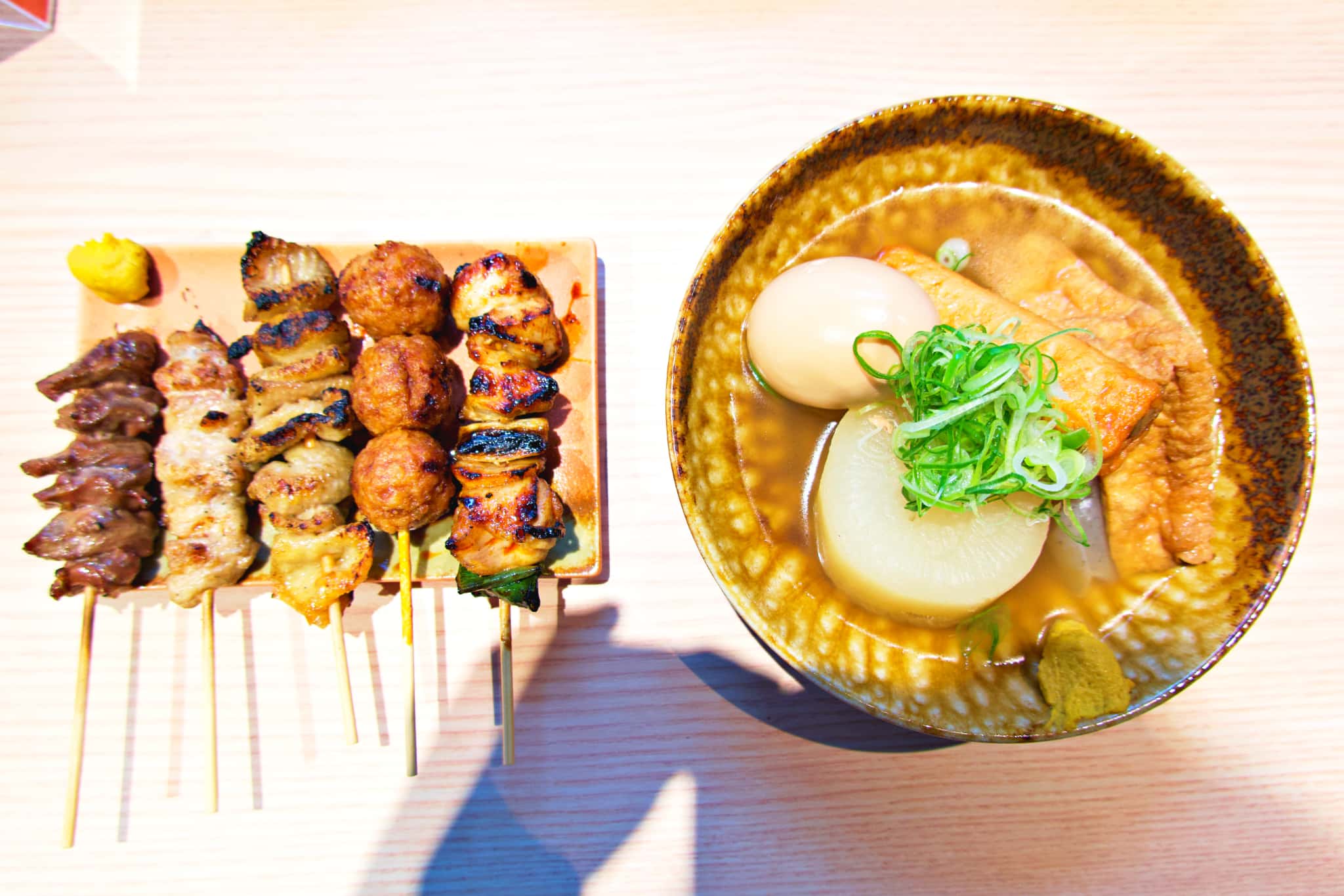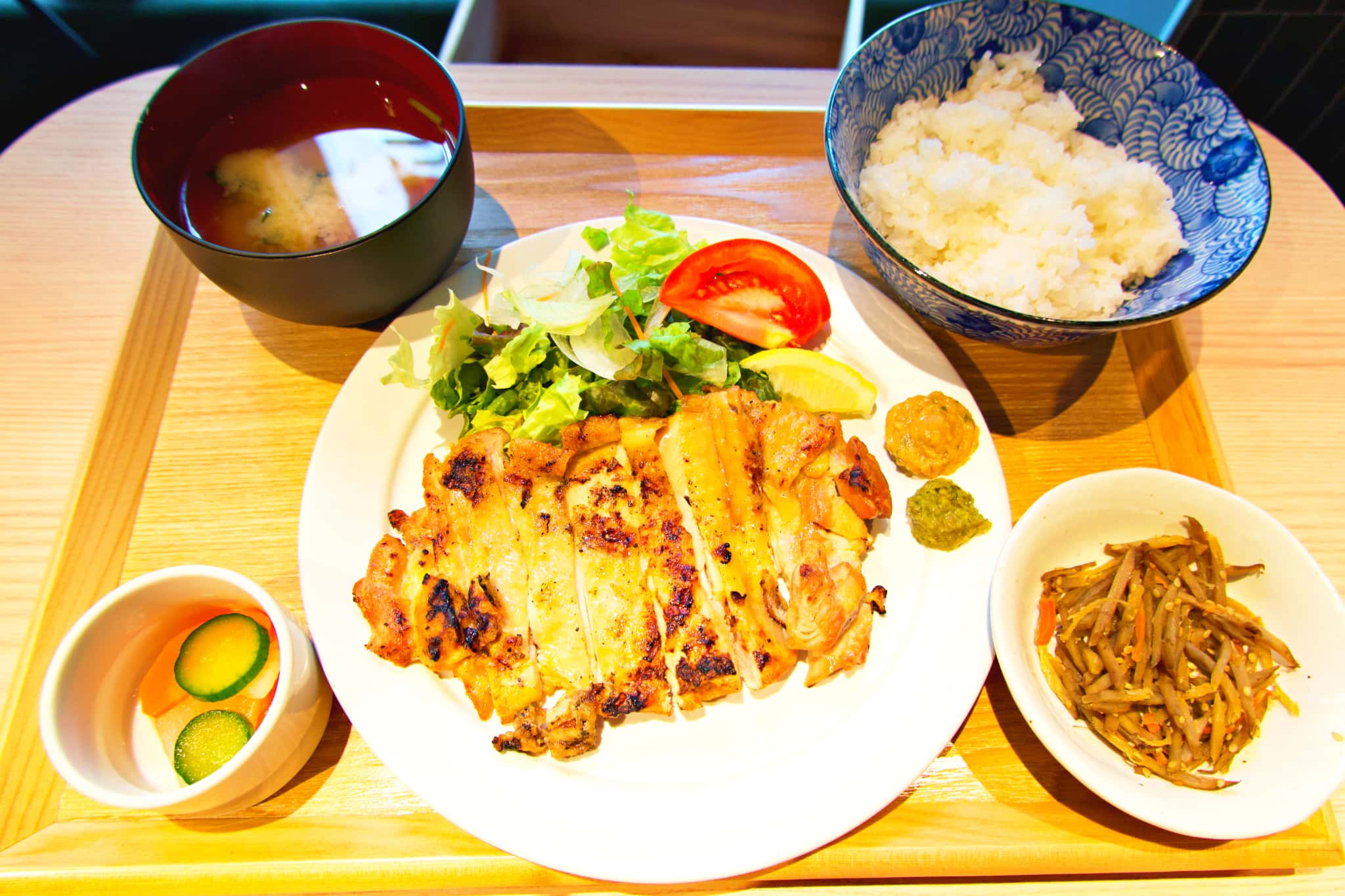 商業施設では珍しい、炭火焼きならではの香ばしさを堪能できるのが特徴で、ディナーではおすすめの串が楽しめる「五楼セレクト7」(1,350円)や、ダシがしっかり染み込んだ「あご出汁おでん5種盛り合わせ」(750円)などが人気。ランチタイムは、香ばしく焼き上げた「炭火焼き鶏もも定食」(1,299円)、鶏のうま味を詰め込んだ「焼鳥重定食」(1,299円)など、食べごたえ抜群のメニューがそろいます。