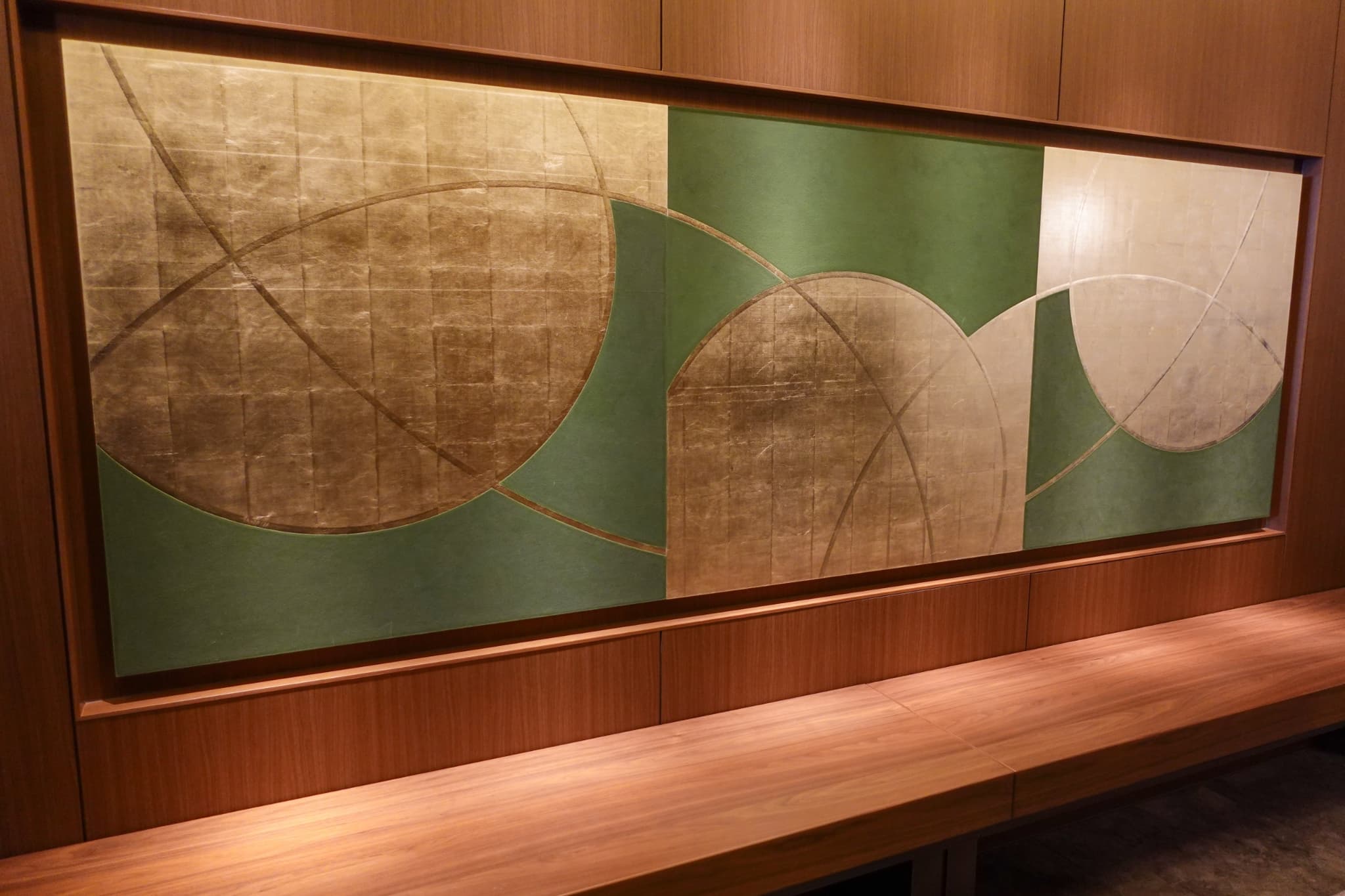 アール・デコの幾何学的な美しさと和の要素が調和した館内には、随所にアートが点在。28階のエレベーターホールには、金箔を用いた絵画が飾られ、日本の伝統と現代性を表現しています。