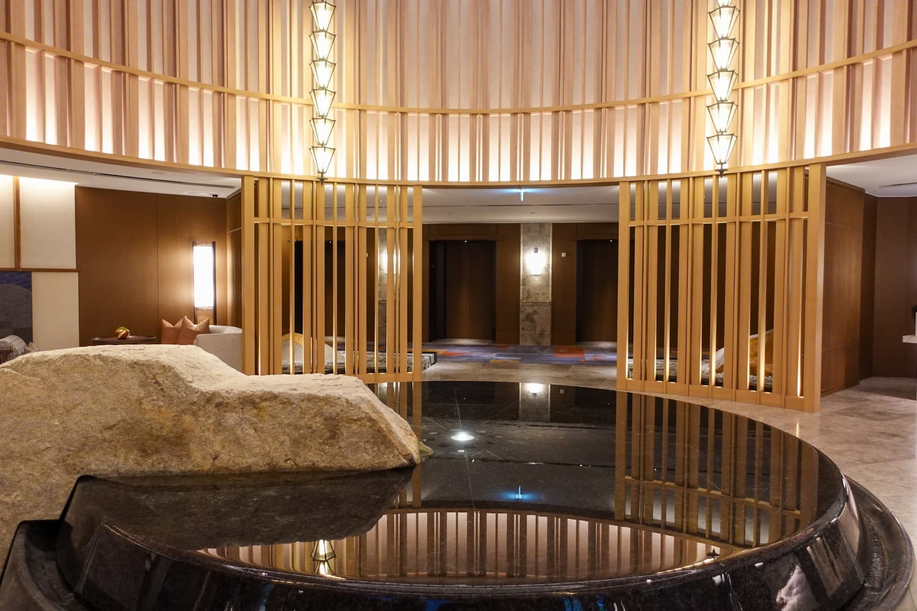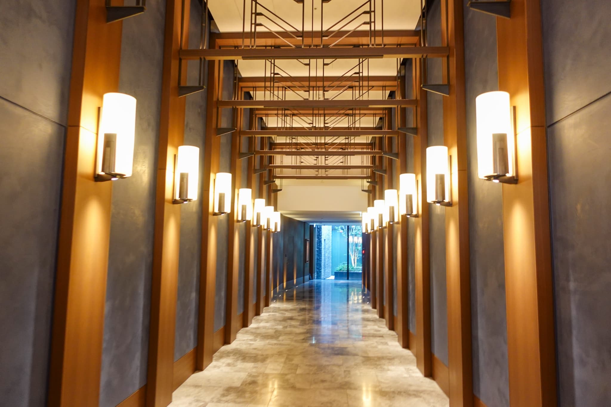 さらに内装にも注目を。29階には伏見稲荷大社の千本鳥居を思わせる回廊が広がり、その先には椿が植えられたガラス張りの中庭が。さらに進むと、約3000本もの木材と石材が調和したモダンなロビーへとつながり、大阪にいることを忘れてしまう、別世界が広がっています。