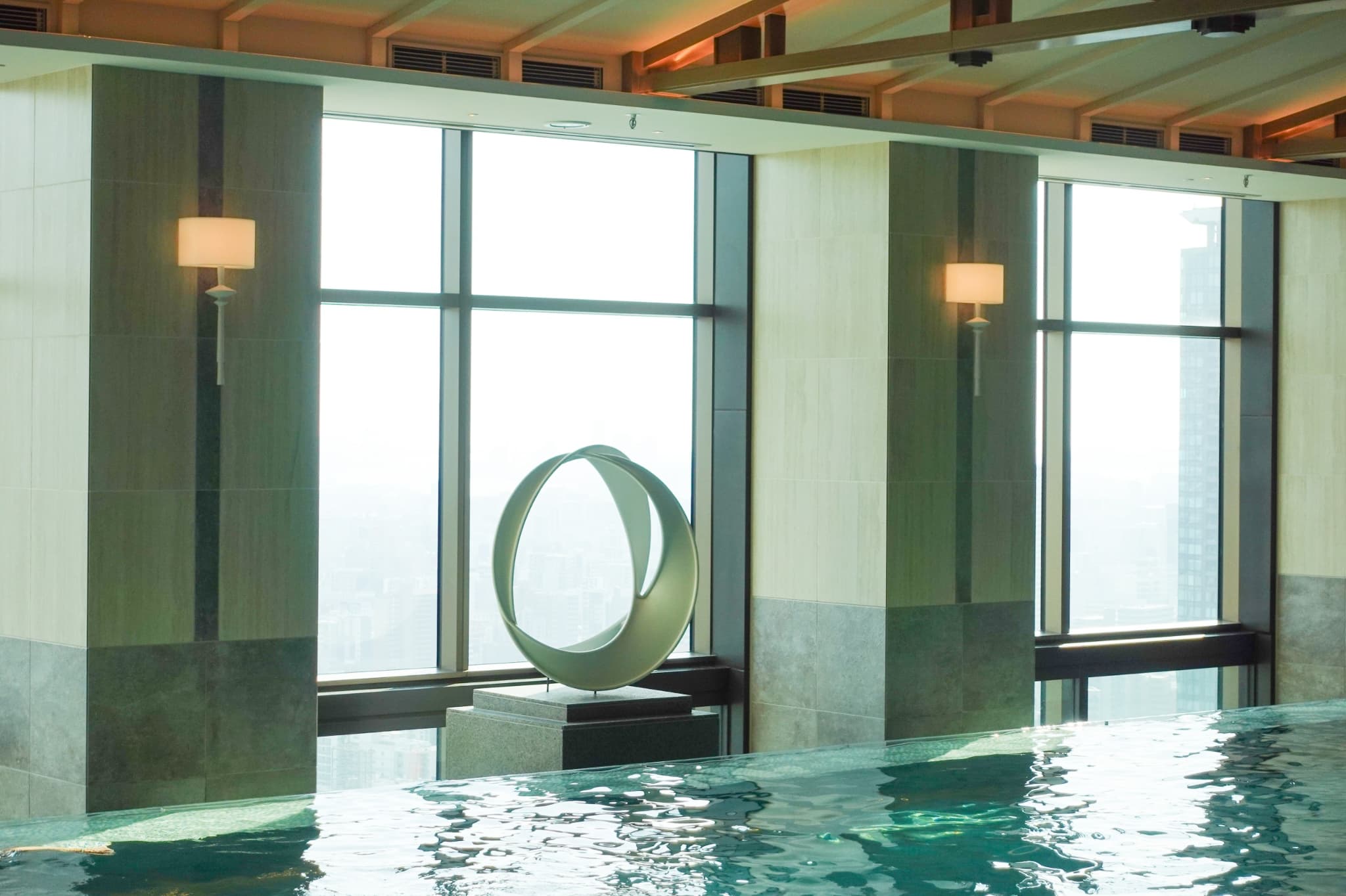 30階スパのエントランスに飾られているのは、きらきら輝くガラスアート。板ガラスを削り出して鏡を仕込むことで、光を拡散しています。宿泊客が利用できるプールには、布とFRP(繊維強化プラスチック)によるモニュメントが展示されています。