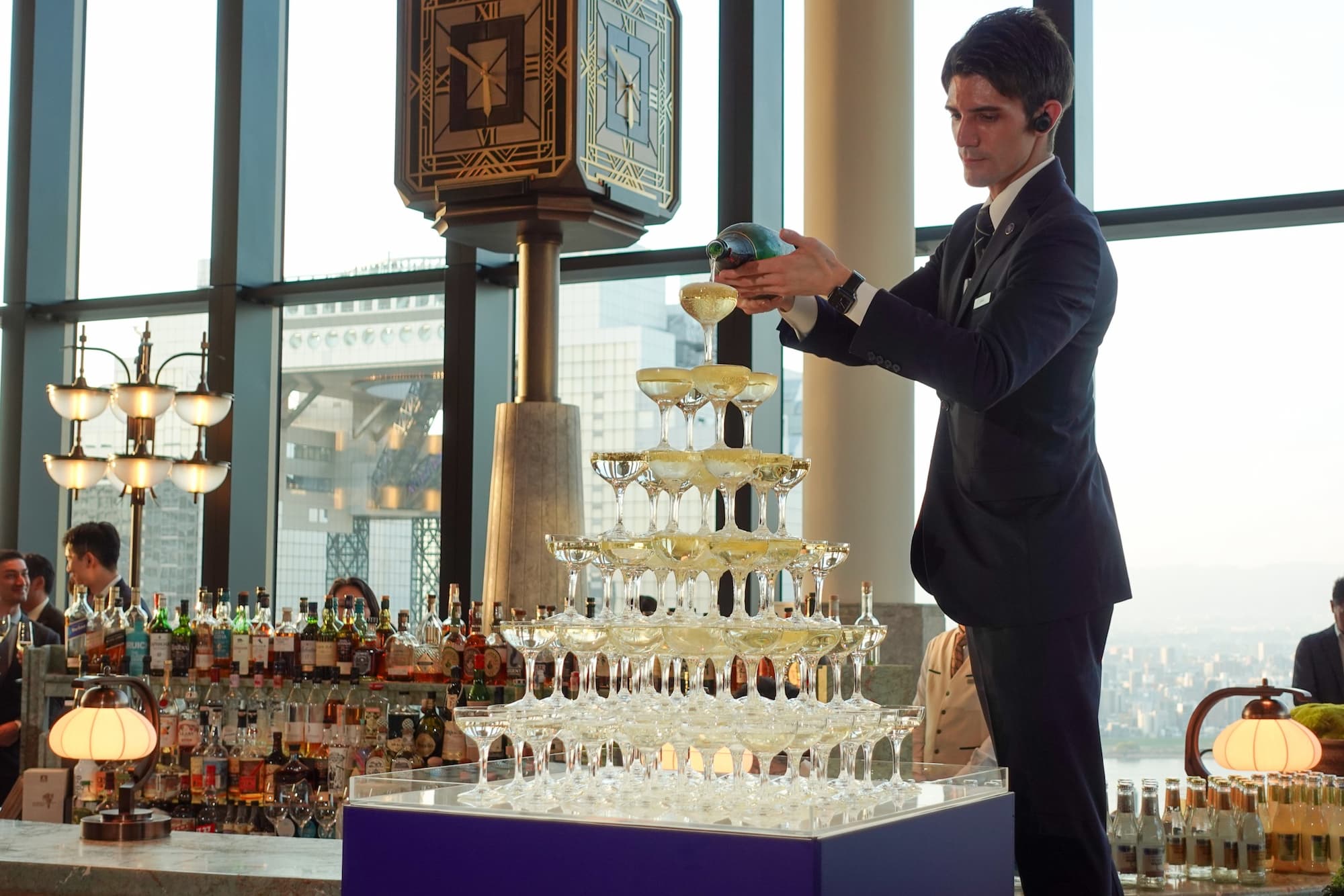 メディア取材会では、フォトセッションやカクテルレセプションも実施されました。会場となった「ピーコック・アレー」の大きな窓からは、夕景から夜景へと移ろう美しい景色が見渡せ、その景色はプライスレスの美しさ。総支配人や副支配人をはじめ、海外出身のスタッフが多く、弦楽の生演奏が響く空間は、まるで異国の社交場のよう。日常を離れた、優雅なひとときを堪能できました。