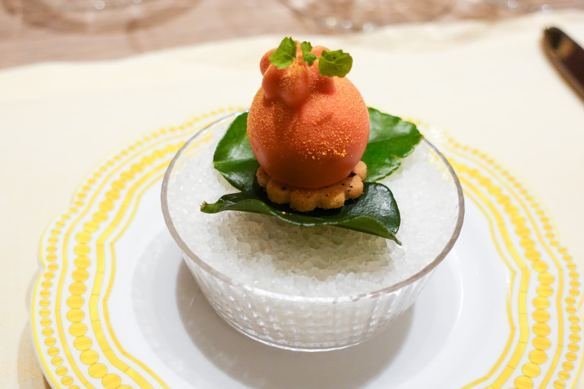 1年を通して柑橘類が収穫できる和歌山から旬の品種を取り寄せているとあって、柑橘で始まり、柑橘で終わる構成。春の恵みと高級食材を惜しみなく盛り込んだ全6皿のディナーコースです。