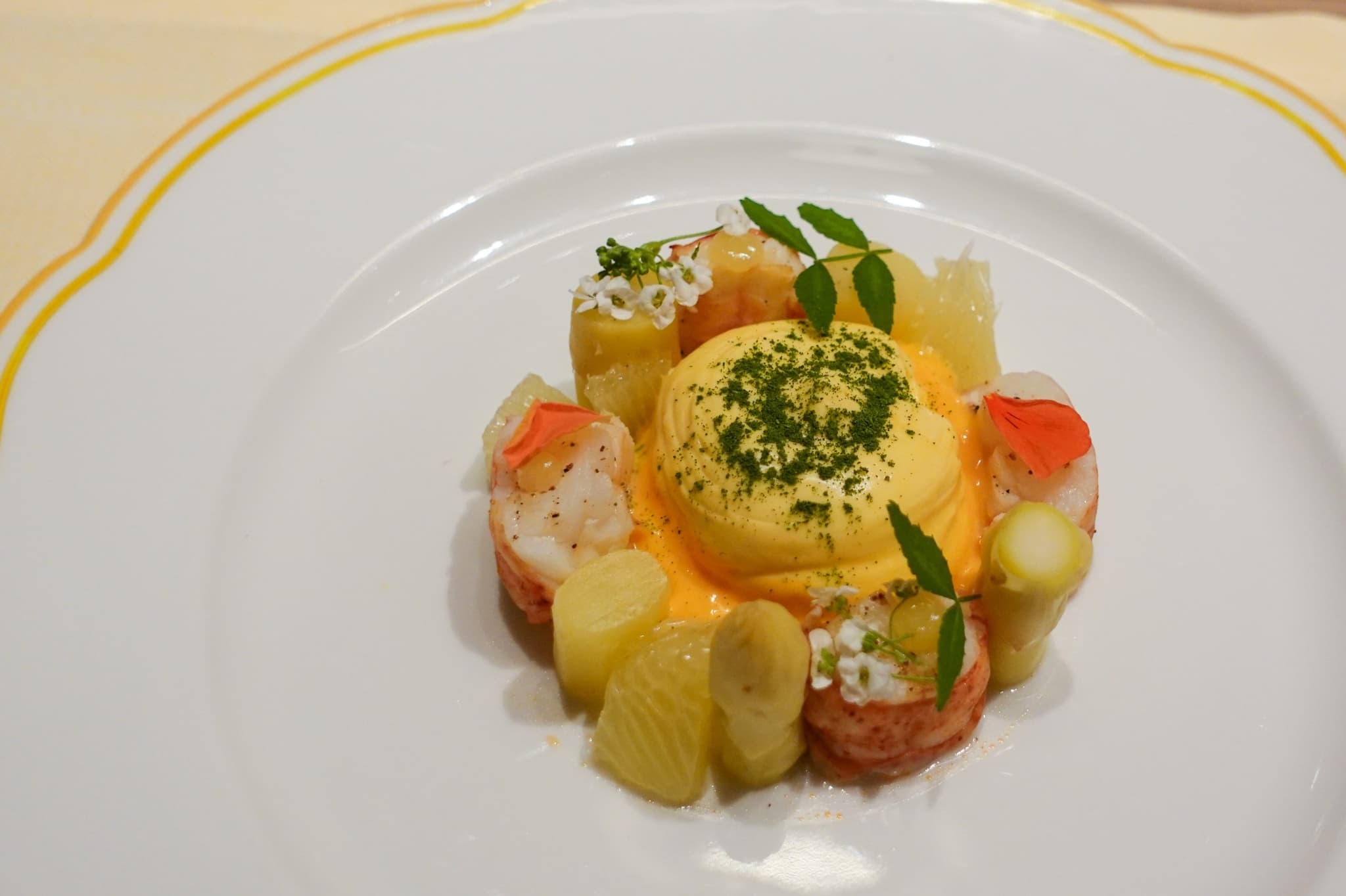 スターターは一口サイズの前菜「フォアグラとデコポン~この場所で生まれた、新たな幕開け~」。フォアグラのテリーヌに、デコポンの鮮やかな酸味を合わせたオードブルで、スパイスが香るサブレもアクセントに。「オマール海老のポシェ~眼下に広がる、瑞々しい緑の情景~」は、オマール海老の甘みをオランデーズソースと共にいただく一皿。木の芽のパウダー、菜の花のピューレ、高知県産文旦の酸味も重なり、香りも後口も爽やかです。