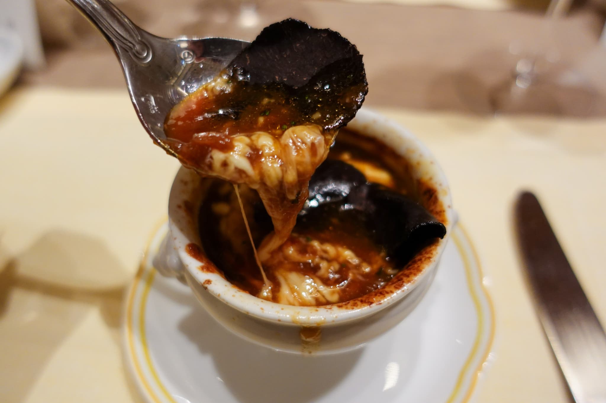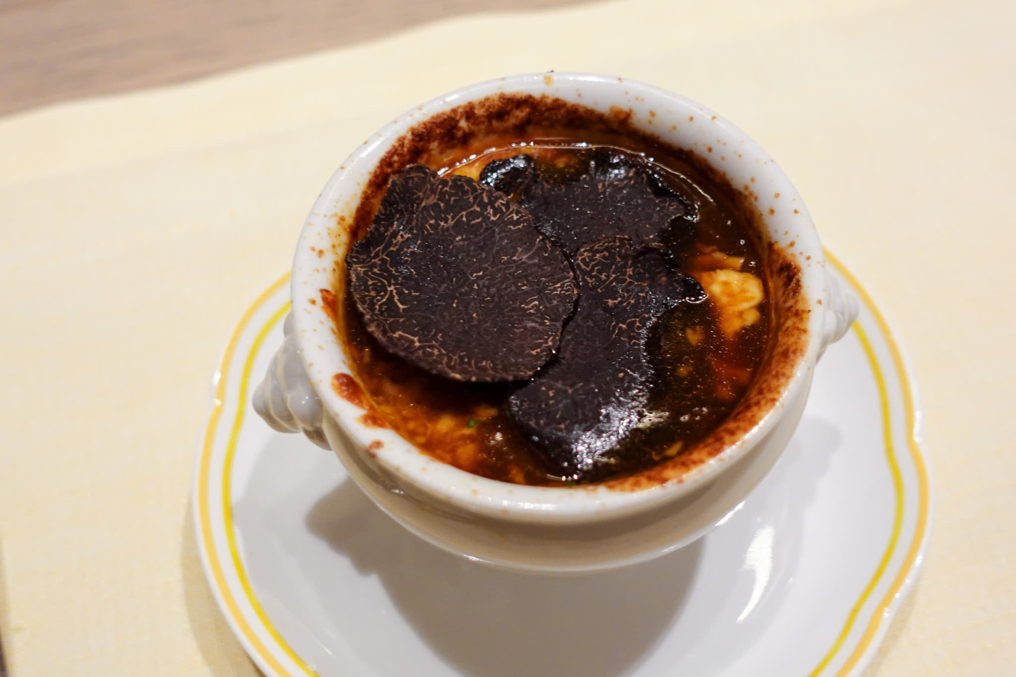 「トリュフとオニオングラタンスープ ~邸宅のように心を包み込むひととき~」は、テーブルに運ばれてきた瞬間に漂うトリュフの香りがなんとも贅沢! じっくりと時間をかけて玉ねぎのうま味が引き出された濃厚なスープに、グリュイエールチーズが溶け込んでいます。