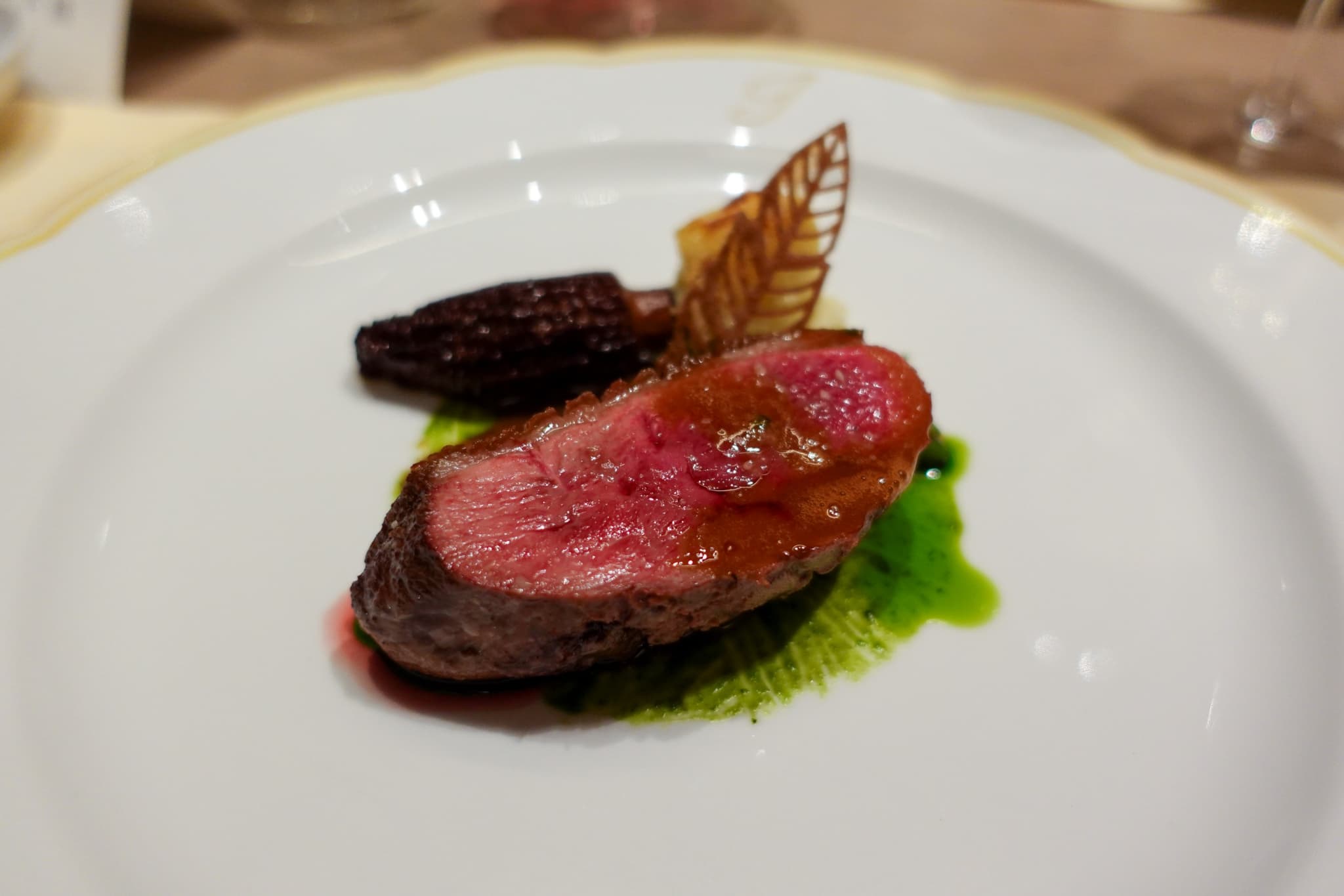 「甘鯛の鱗焼き~水都に広がる、光の情景~」は、香ばしく焼き上げた甘鯛に、甘鯛の骨で出汁をとったコンソメスープを注いで提供されます。澄んだコンソメスープに浮かぶアサツキのオイルが美しく、香りの良さが格別。「七谷鴨胸肉のロティ~共に歩んだ1年、そして未来へ広がる森~」は柔らかく、噛むほどにほのかな甘みと深みのあるうま味が広がります。