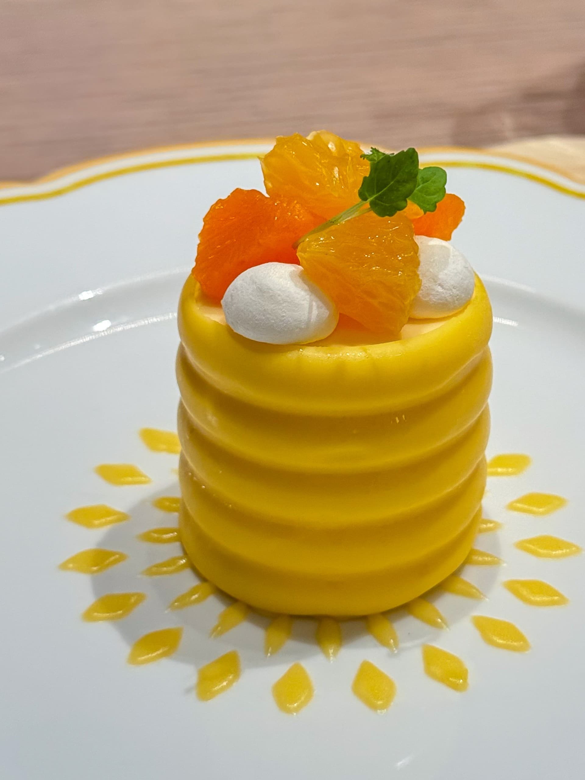 ラストを飾るのは「ジョリー ブラッスリー シグネチャーチーズケーキ ~伝統を纏い、光あふれる明日へ~」。なめらかな口あたりのチーズケーキから、春柑橘のソースがとろりと顔を出します。