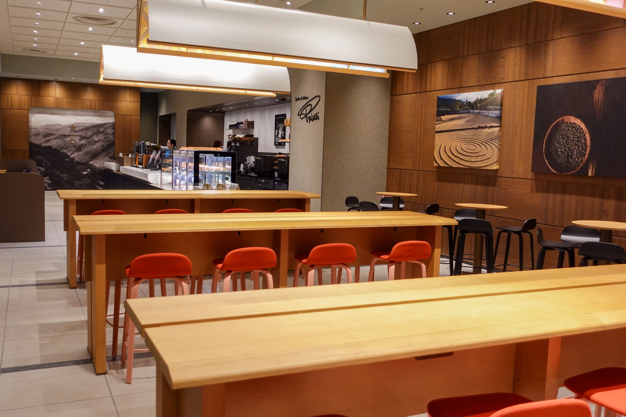 「スターバックス リザーブ(R)カフェ」のコンセプトは「Milanese Kissaten(ミラネーゼ キッサテン)」。ミラノのバール文化と、日本の喫茶店文化という2つの魅力を掛け合わせた空間設計に。開放感のあるテラス風の席や、イタリアンバールのようなハイテーブルの席、落ち着いたトーンで統一されたラウンジ席など、多彩なシートが用意されています。