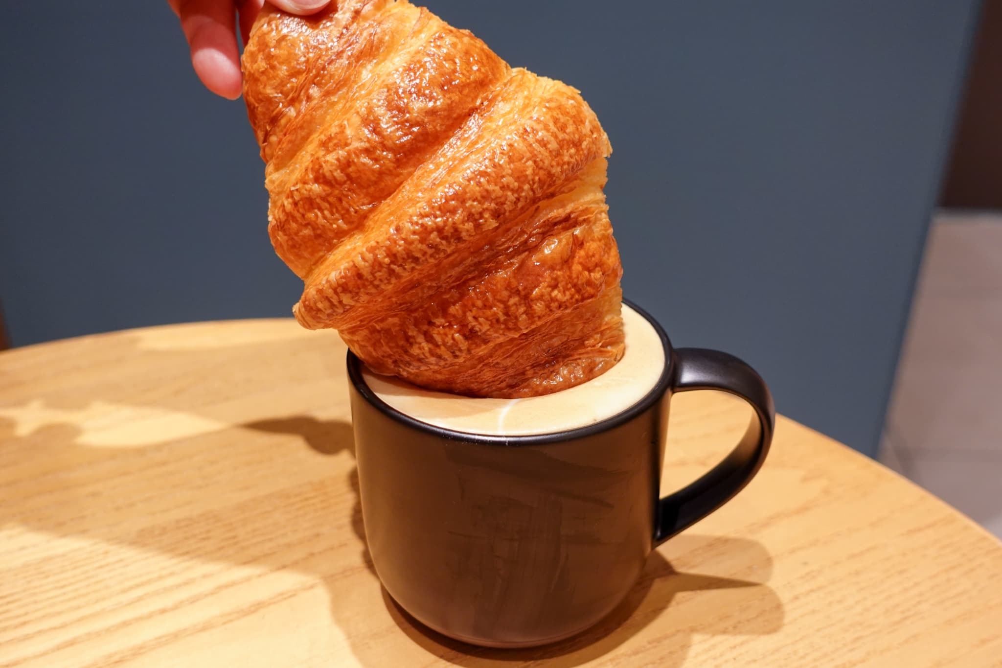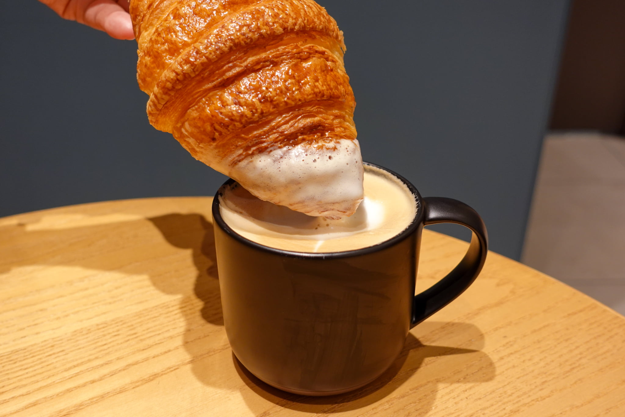 このカフェでぜひ体験したいのが、イタリアンベーカリー「プリンチ(R)」のクロワッサン「コルネッティ」とラテを組み合わせた楽しみ方。イタリア・ミラノでは、クロワッサンをカプチーノに軽く浸して味わう“ディップスタイル”が定番です。