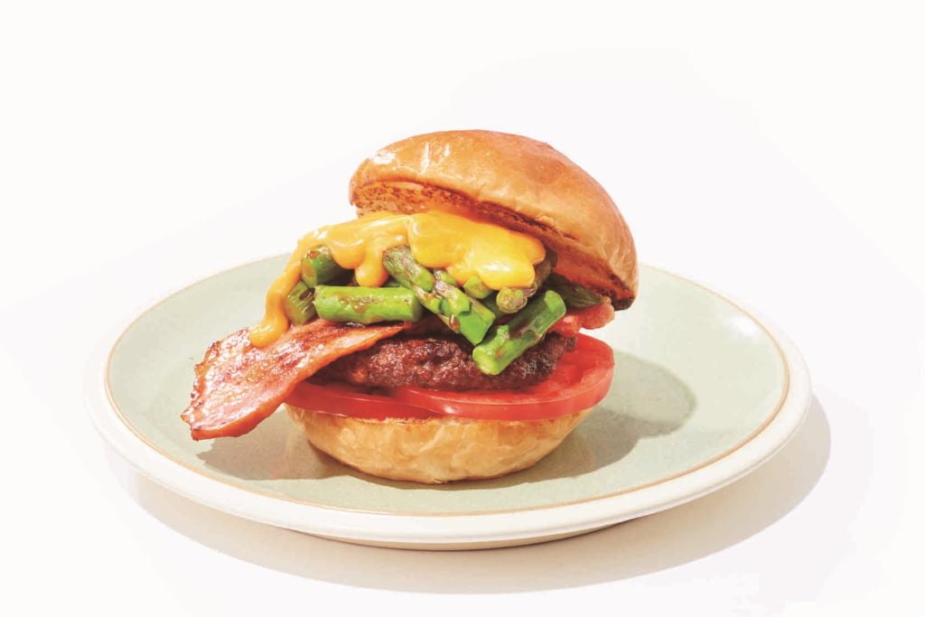 【大阪高島屋限定】「The Cheese Burger ESSEN」の「こぼれそうなアスパラとはみ出すベーコンチーズバーガー」(1,458円)※4月28日(火)まで販売