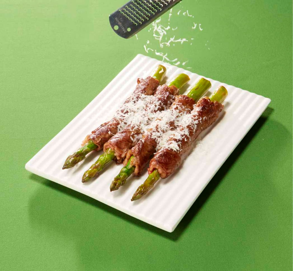 大地の恵みからは、早春の雪解け水と昼夜の寒暖差によって栄養をたっぷりと蓄えた「アスパラガス」が登場。「トヨニシファーム」の「帯広牛×アスパラ巻き(グラナパダーノチーズ)」は、帯広牛とアスパラガスを同時に堪能できるという贅沢さ! グラナパダーノチーズをかけてマイルドな味わいに仕上げています。